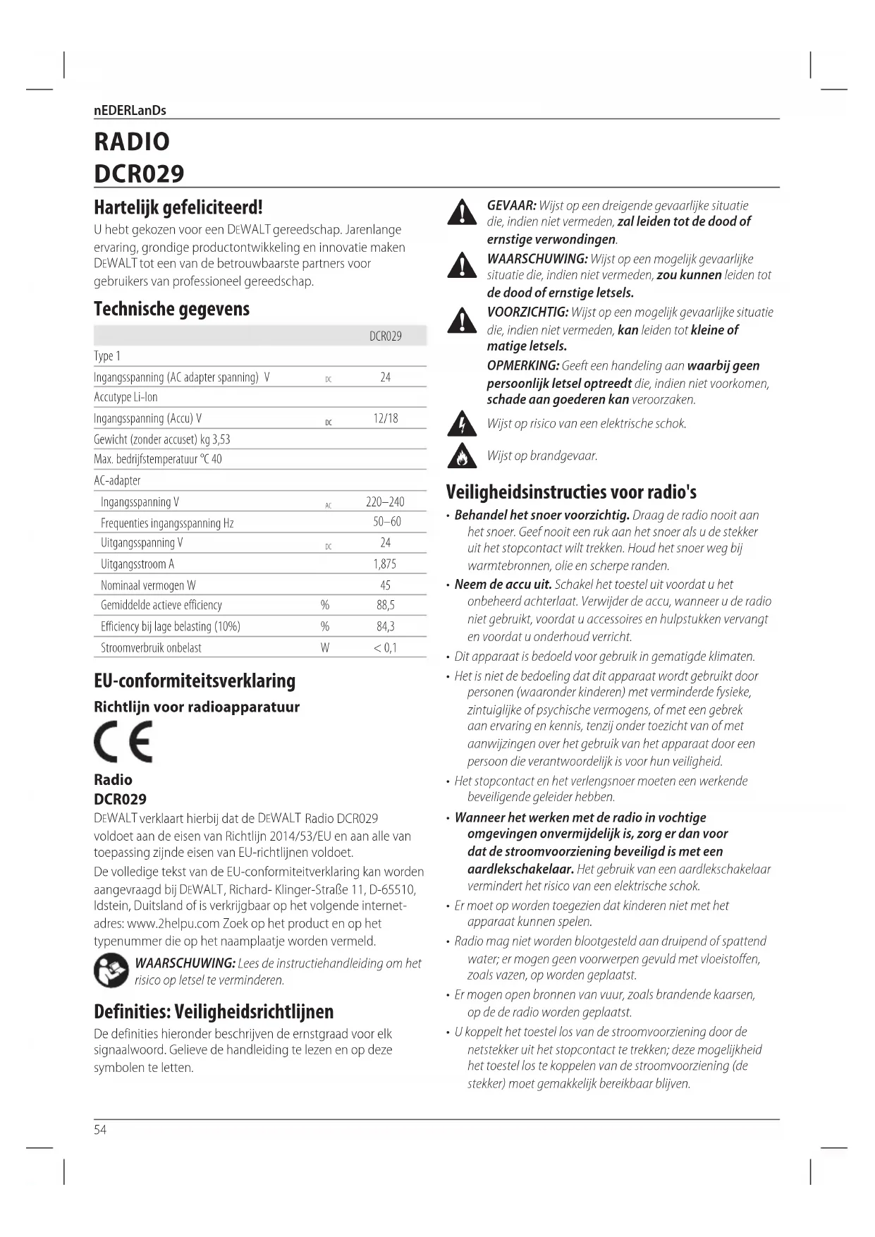 Gemiddelde actieve efficiency % 88,5 Efficiency bij lage belasting (10%) % 84,3 Stroomverbruik onbelast W < 0,1 EU-conformiteitsverklaring Richtlijn voor radioapparatuur Radio DCR029 DeWALT verklaart hierbij dat de DeWALT Radio DCR029 voldoet aan de eisen van Richtlijn 2014/53/EU en aan alle van toepassing zijnde eisen van EU-richtlijnenvoldoet. De volledige tekst van de EU-conformiteitverklaring kan worden aangevraagd bij DeWALT , Richard- Klinger-Straße 11, D-65510, Idstein, Duitsland of is verkrijgbaar op het volgende internet- adres: www.2helpu.com Zoek op het product en op het typenummer die op het naamplaatje wordenvermeld. WAARSCHUWING: Lees de instructiehandleiding om het risico op letsel teverminderen. Definities: Veiligheidsrichtlijnen De definities hieronder beschrijven de ernstgraad voor elk signaalwoord. Gelieve de handleiding te lezen en op deze symbolen teletten.