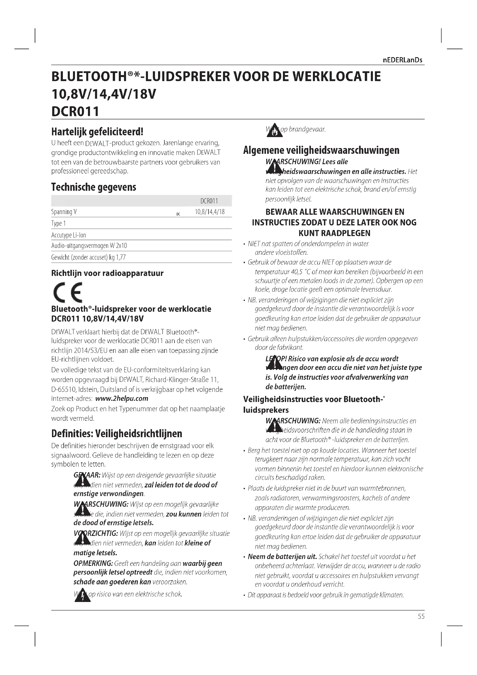 DeWALT verklaart hierbij dat de DeWALT Bluetooth®- luidspreker voor de werklocatie DCR011 aan de eisen van richtlijn 2014/53/EU en aan alle eisen van toepassing zijnde EU-richtlijnenvoldoet. De volledige tekst van de EU-conformiteitsverklaring kan worden opgevraagd bij DeWALT , Richard-Klinger-Straße 11, D-65510, Idstein, Duitsland of is verkrijgbaar op het volgende internet-adres: www.2helpu.com Zoek op Product en het Typenummer dat op het naamplaatje wordtvermeld. Definities: Veiligheidsrichtlijnen De definities hieronder beschrijven de ernstgraad voor elk signaalwoord. Gelieve de handleiding te lezen en op deze symbolen teletten.