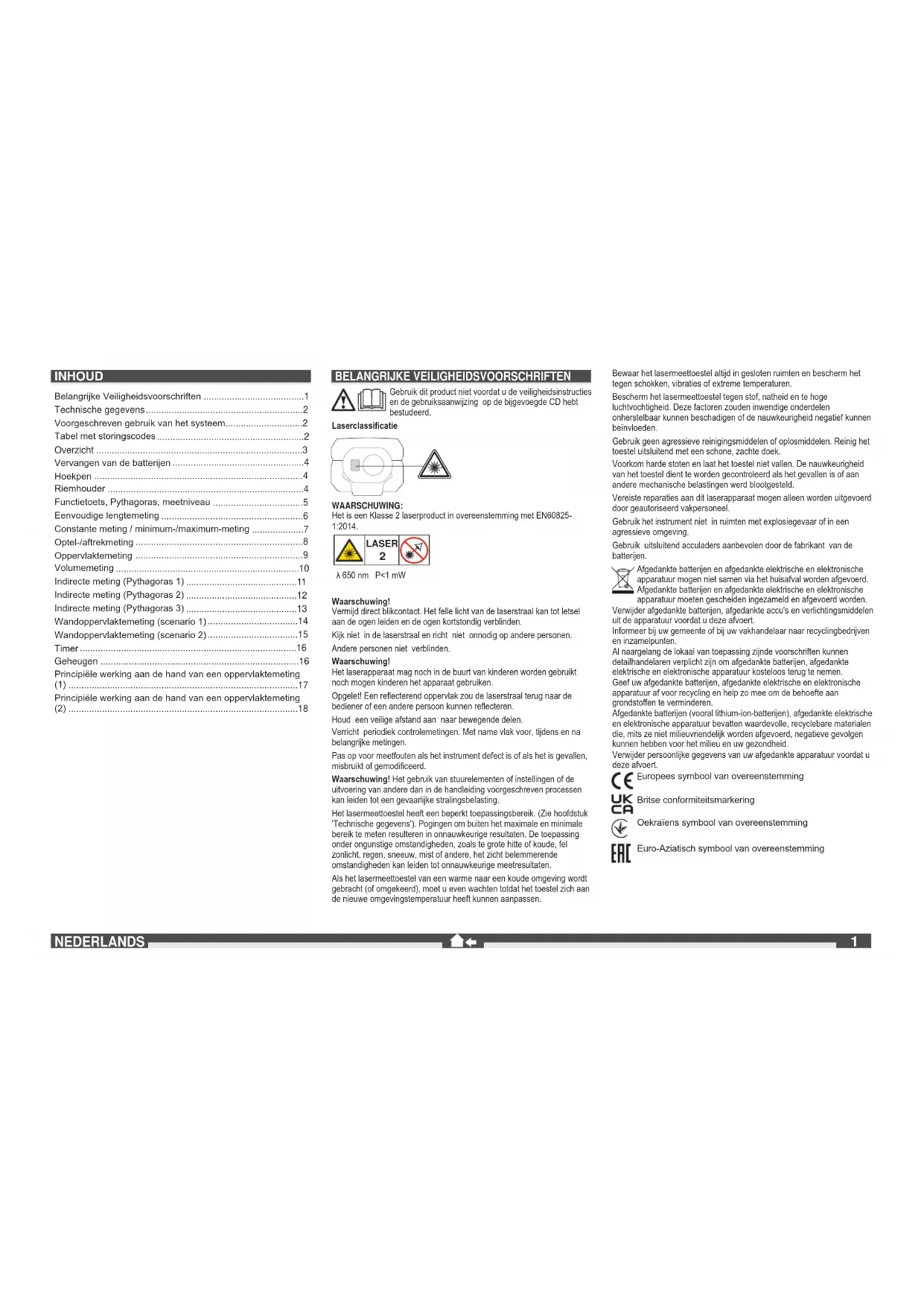 uropees symbool van overeenstemming Britse conformiteitsmarkering Oekraïens symbool van overeenstemming Euro-Aziatisch symbool van overeenstemming INHOUD Belangrijke Veiligheidsvoorschriften .......................................1 Technische gegevens