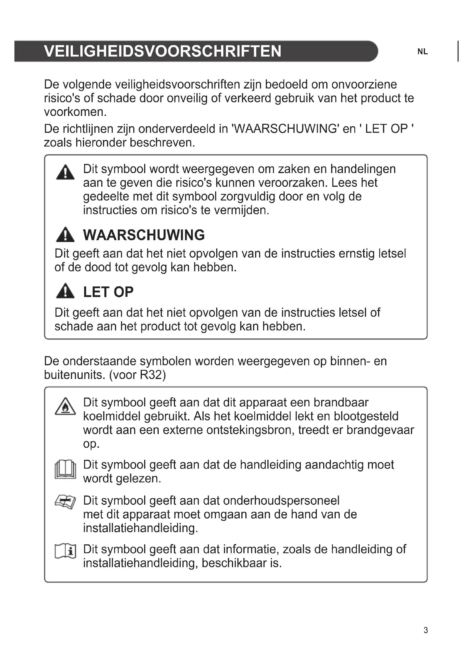 VEILIGHEIDSVOORSCHRIFTEN De volgende veiligheidsvoorschriften zijn bedoeld om onvoorziene risico's of schade door onveilig of verkeerd gebruik van het product te voorkomen. De richtlijnen zijn onderverdeeld in 'WAARSCHUWING' en ' LET OP ' zoals hieronder beschreven. Dit symbool wordt weergegeven om zaken en handelingen aan te geven die risico's kunnen veroorzaken. Lees het gedeelte met dit symbool zorgvuldig door en volg de instructies om risico's te vermijden. WAARSCHUWING Dit geeft aan dat het niet opvolgen van de instructies ernstig letsel of de dood tot gevolg kan hebben. LET OP Dit geeft aan dat het niet opvolgen van de instructies letsel of schade aan het product tot gevolg kan hebben. De onderstaande symbolen worden weergegeven op binnen- en buitenunits. (voor R32) Dit symbool geeft aan dat dit apparaat een brandbaar koelmiddel gebruikt. Als het koelmiddel lekt en blootgesteld wordt aan een externe ontstekingsbron, treedt er brandgevaar op. Dit symbool geeft aan dat de handleiding aandachtig moet wordt gelezen. Dit symbool geeft aan dat onderhoudspersoneel met dit apparaat moet omgaan aan de hand van de installatiehandleiding. Dit symbool geeft aan dat informatie, zoals de handleiding of installatiehandleiding, beschikbaar is.4