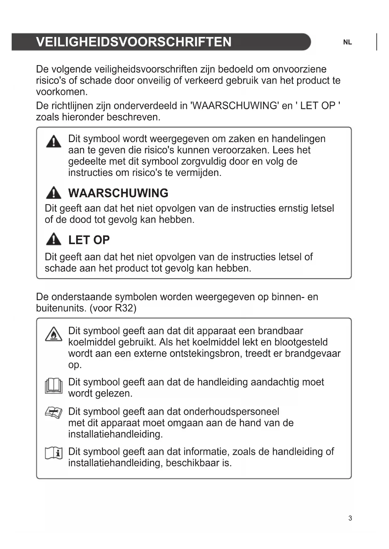 VEILIGHEIDSVOORSCHRIFTEN De volgende veiligheidsvoorschriften zijn bedoeld om onvoorziene risico's of schade door onveilig of verkeerd gebruik van het product te voorkomen. De richtlijnen zijn onderverdeeld in 'WAARSCHUWING' en ' LET OP ' zoals hieronder beschreven. Dit symbool wordt weergegeven om zaken en handelingen aan te geven die risico's kunnen veroorzaken. Lees het gedeelte met dit symbool zorgvuldig door en volg de instructies om risico's te vermijden. WAARSCHUWING Dit geeft aan dat het niet opvolgen van de instructies ernstig letsel of de dood tot gevolg kan hebben. LET OP Dit geeft aan dat het niet opvolgen van de instructies letsel of schade aan het product tot gevolg kan hebben. De onderstaande symbolen worden weergegeven op binnen- en buitenunits. (voor R32) Dit symbool geeft aan dat dit apparaat een brandbaar koelmiddel gebruikt. Als het koelmiddel lekt en blootgesteld wordt aan een externe ontstekingsbron, treedt er brandgevaar op. Dit symbool geeft aan dat de handleiding aandachtig moet wordt gelezen. Dit symbool geeft aan dat onderhoudspersoneel met dit apparaat moet omgaan aan de hand van de installatiehandleiding. Dit symbool geeft aan dat informatie, zoals de handleiding of installatiehandleiding, beschikbaar is.4