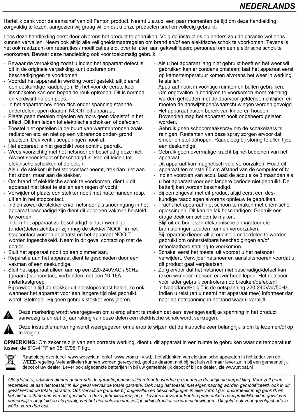 Alle (defecte) artikelen dienen gedurende de garantieperiode altijd retour te worden gezonden in de originele verpakking. Voer zelf geen reparaties uit aan het toestel; in élk geval vervalt de totale garantie. Ook mag het toestel niet eigenmachtig worden gemodificeerd, ook in dit geval vervalt de totale garantie. Ook vervalt de garantie bij ongevallen en beschadigingen in élke vorm t.g.v. onoordeelkundig gebruik en het niet in achtnemen van het gestelde in deze gebruiksaanwijzing. Tevens aanvaardt Fenton geen enkele aansprakelijkheid in geval van persoonlijke ongelukken als gevolg van het niet naleven van veiligheidsinstructies en waarschuwingen . Dit geldt ook voor gevolgschade in wélke vorm dan ook.7 OVERZICHT