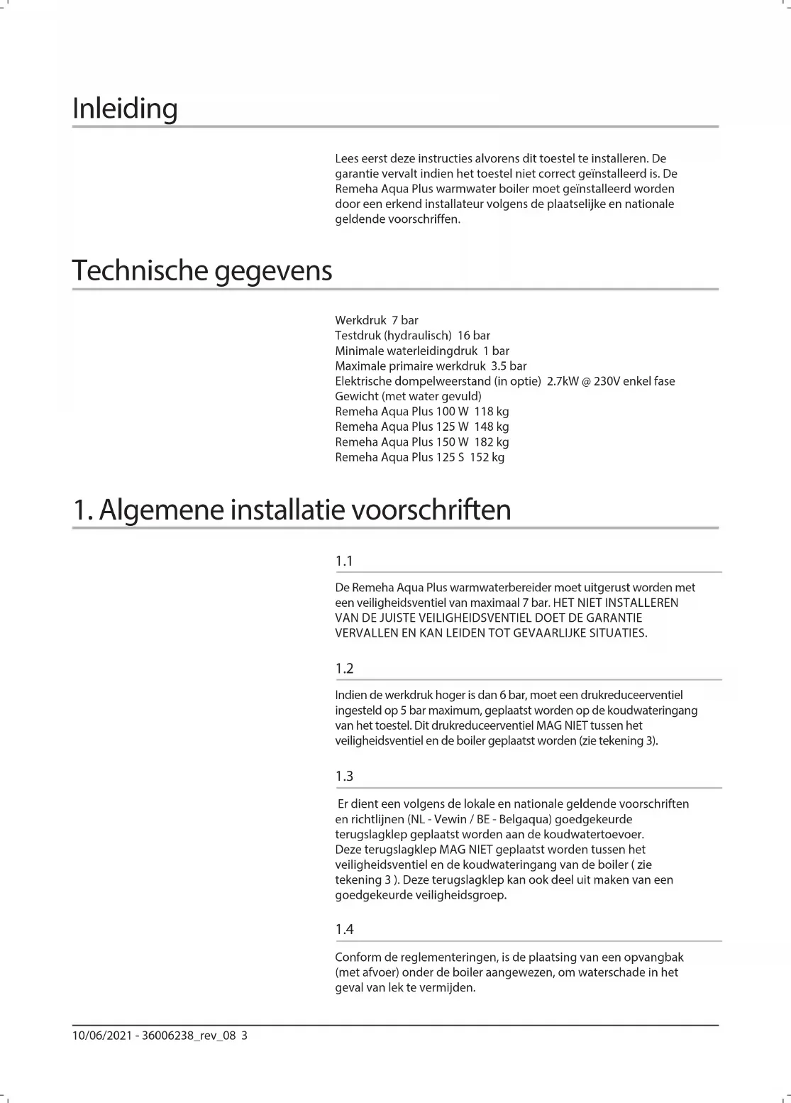 Conform de reglementeringen, is de plaatsing van een opvangbak (met afvoer) onder de boiler aangewezen, om waterschade in het geval van lek te vermijden.4 10/06/2021 - 36006238_rev_08