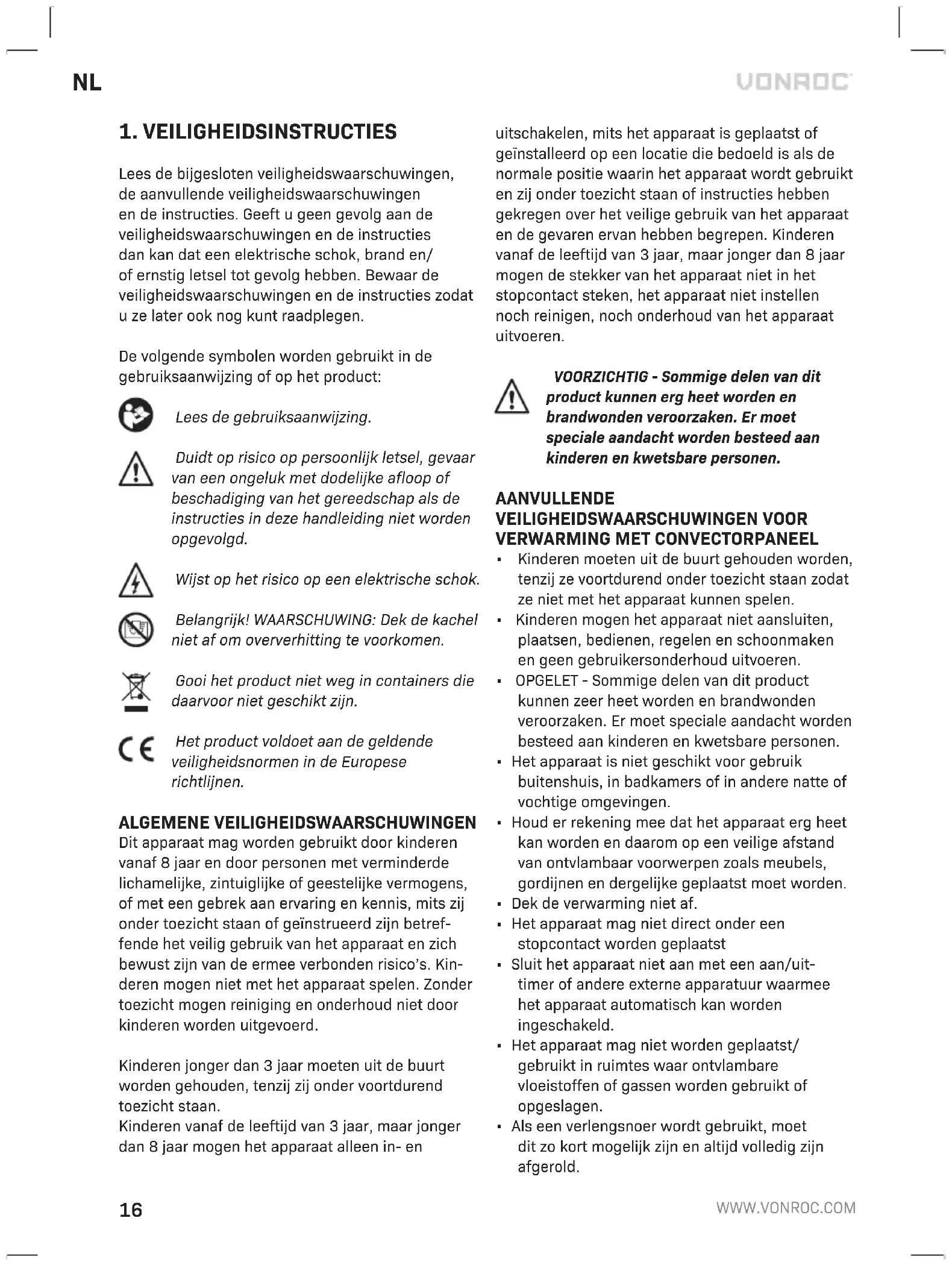 Lees de bijgesloten veiligheidswaarschuwingen, de aanvullende veiligheidswaarschuwingen en de instructies. Geeft ugeen gevolg aan de veiligheidswaarschuwingen en de instructies dan kan dat een elektrische schok, brand en/ of ernstig letsel tot gevolg hebben. Bewaar de veiligheidswaarschuwingen en de instructies zodat uze later ook nog kunt raadplegen. De volgende symbolen worden gebruikt in de gebruiksaanwijzing of op het product: Lees de gebruiksaanwijzing. Duidt op risico op persoonlijk letsel, gevaar van een ongeluk met dodelijke afloop of beschadiging van het gereedschap als de instructies in deze handleiding niet worden opgevolgd. Wijst op het risico op een elektrische schok. Belangrijk! WAARSCHUWING: Dek de kachel niet af om oververhitting te voorkomen. Gooi het product niet weg in containers die daarvoor niet geschikt zijn. Het product voldoet aan de geldende veiligheidsnormen in de Europese richtlijnen. ALGEMENE VEILIGHEIDSWAARSCHUWINGEN Dit apparaat mag worden gebruikt door kinderen vanaf 8 jaar en door personen met verminderde lichamelijke, zintuiglijke of geestelijke vermogens, of met een gebrek aan ervaring en kennis, mits zij onder toezicht staan of geïnstrueerd zijn betref- fende het veilig gebruik van het apparaat en zich bewust zijn van de ermee verbonden risico’s. Kin- deren mogen niet met het apparaat spelen. Zonder toezicht mogen reiniging en onderhoud niet door kinderen worden uitgevoerd. Kinderen jonger dan 3 jaar moeten uit de buurt worden gehouden, tenzij zij onder voortdurend toezicht staan. Kinderen vanaf de leeftijd van 3 jaar, maar jonger dan 8 jaar mogen het apparaat alleen in- en uitschakelen, mits het apparaat is geplaatst of geïnstalleerd op een locatie die bedoeld is als de normale positie waarin het apparaat wordt gebruikt en zij onder toezicht staan of instructies hebben gekregen over het veilige gebruik van het apparaat en de gevaren ervan hebben begrepen. Kinderen vanaf de leeftijd van 3 jaar, maar jonger dan 8 jaar mogen de stekker van het apparaat niet in het stopcontact steken, het apparaat niet instellen noch reinigen, noch onderhoud van het apparaat uitvoeren. VOORZICHTIG - Sommige delen van dit product kunnen erg heet worden en brandwonden veroorzaken. Er moet speciale aandacht worden besteed aan kinderen en kwetsbare personen. AANVULLENDE VEILIGHEIDSWAARSCHUWINGEN VOOR
