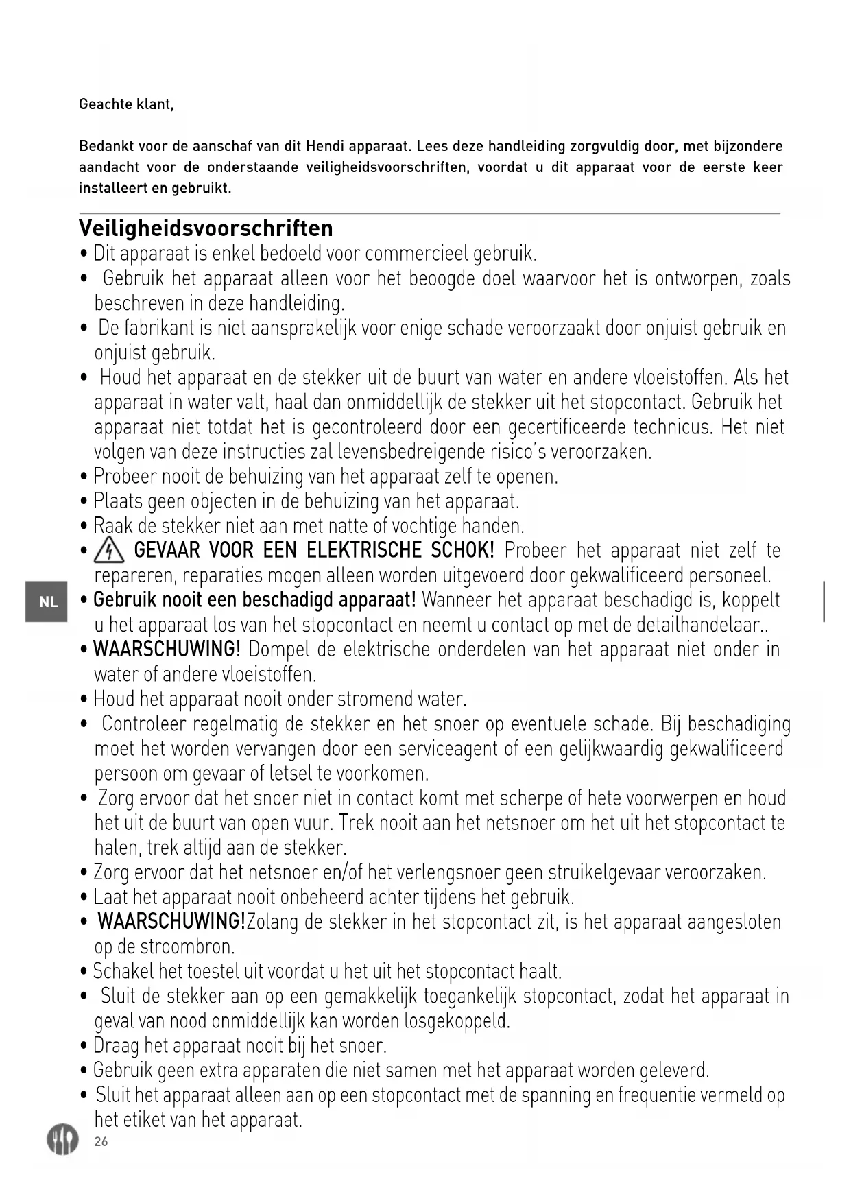 Geachte klant, Bedankt voor de aanschaf van dit Hendi apparaat. Lees deze handleiding zorgvuldig door, met bijzondere aandacht voor de onderstaande veiligheidsvoorschriften, voordat u dit apparaat voor de eerste keer installeert en gebruikt. Veiligheidsvoorschriften