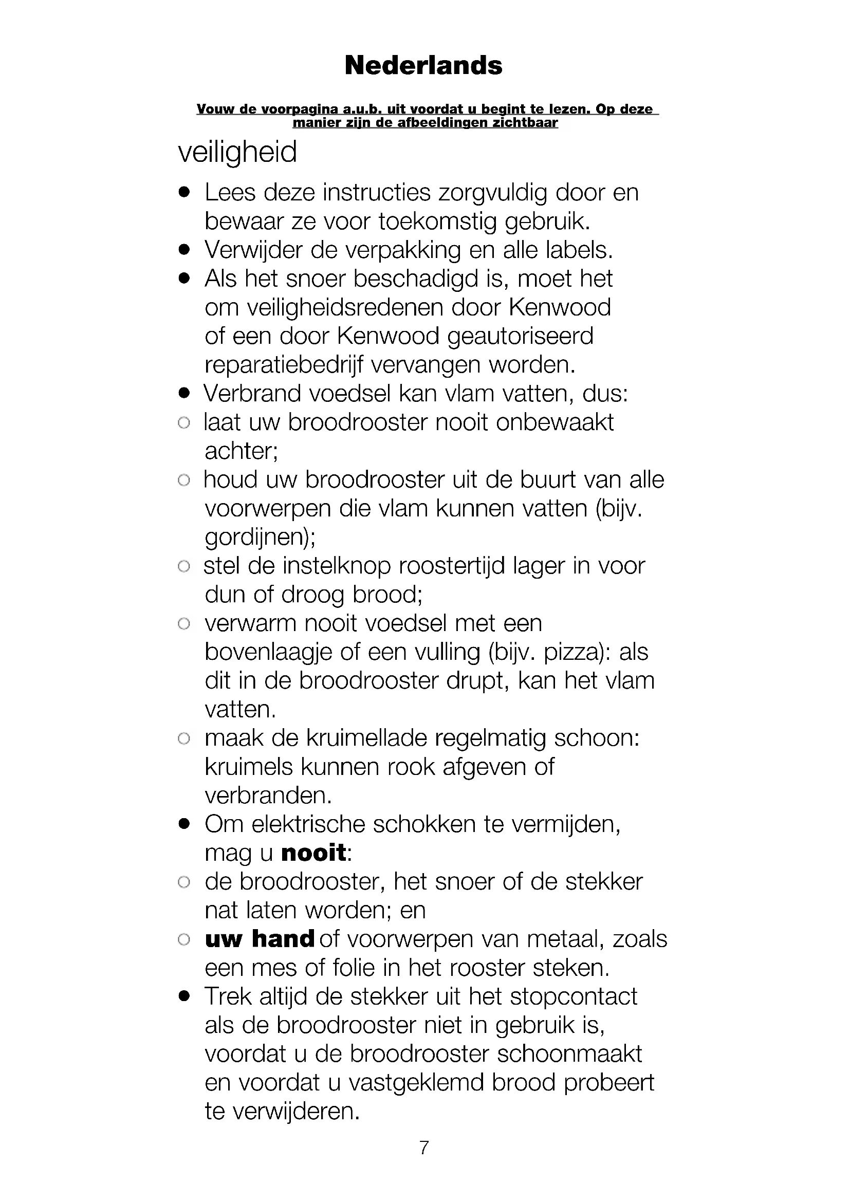 Trek altijd de stekker uit het stopcontact als de broodrooster niet in gebruik is, voordat u de broodrooster schoonmaakt en voordat u vastgeklemd brood probeert te verwijderen. Vouw de voorpagina a.u.b. uit voordat u begint te lezen. Op deze manier zijn de afbeeldingen zichtbaarEnglish