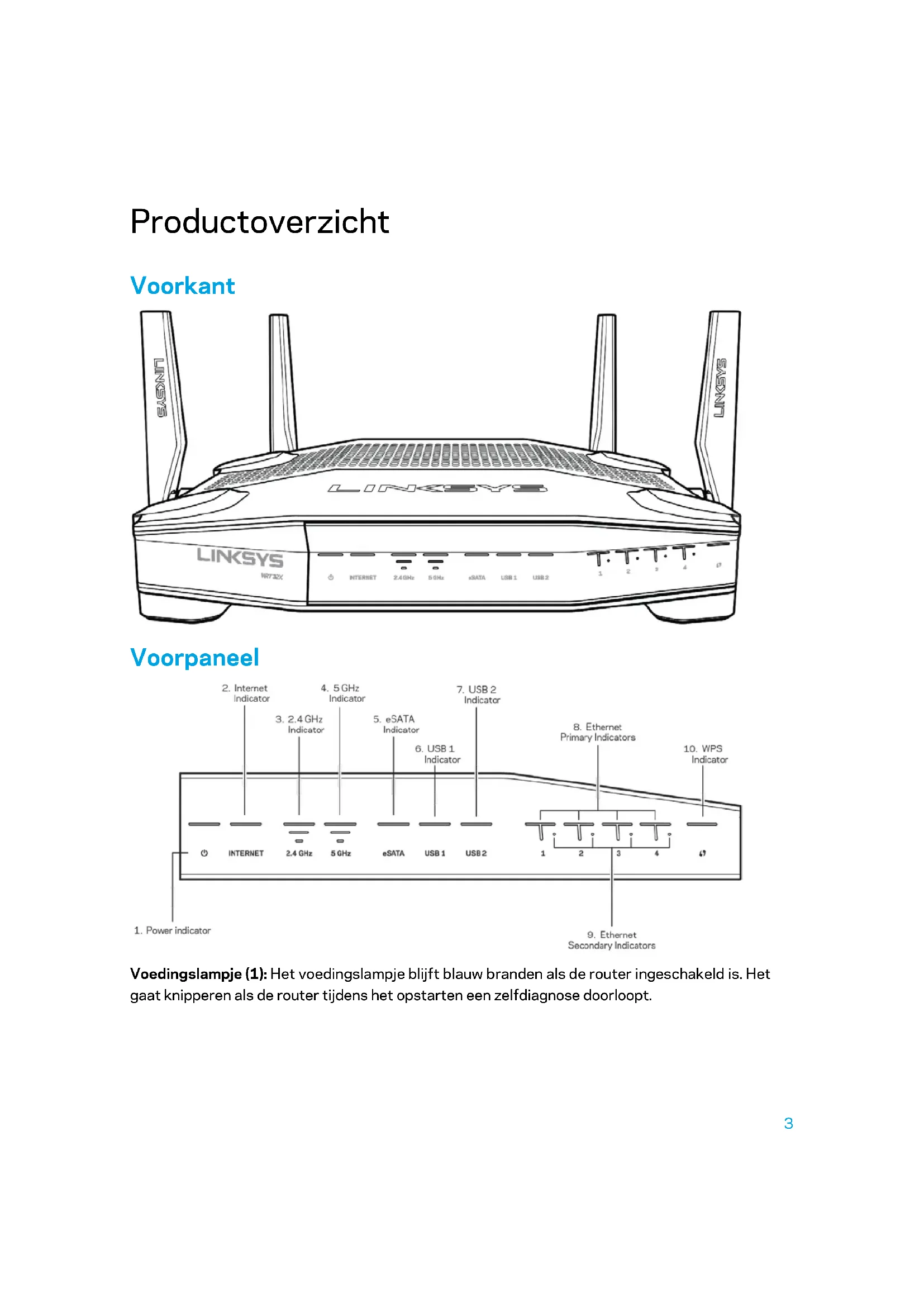 - Milieu Productoverzicht Voorkant Voorpaneel Voedingslampje (1): Het voedingslampje blijft blauw branden als de router ingeschakeld is. Het gaat knipperen als de router tijdens het opstarten een zelfdiagnose doorloopt.4 Internetlampje (2): Het internetlampje blijft blauw branden als de router verbonden is met het internet. Het knippert als de router bezig is een verbinding tot stand te brengen. Een lampje dat oranje blijft branden, betekent dat de verbinding verbroken is als gevolg van configuratieproblemen. Een knipperend oranje lampje betekent dat de verbinding verbroken is als gevolg van hardwareproblemen. 2,4GHz-lampje (3): Het lampje blijft blauw branden als één of meer clients verbonden zijn met het 2,4GHz-netwerk. Het lampje knippert als de router gegevens verzendt of ontvangt via het 2,4GHz-netwerk. 5GHz-lampje (4): Het lampje blijft blauw branden als één of meer clients verbonden zijn met het 5GHz-netwerk. Het lampje knippert als de router gegevens verzendt of ontvangt via het 5GHz- netwerk. eSATA-lampje (5): Als het lampje uit is, dan is de USB/eSATA-poort uitgeschakeld (niet actief) of dan is er een USB-apparaat aangesloten. Het lampje blijft blauw branden als er een eSATA- apparaat is aangesloten. Een knipperend lampje wijst op activiteit op de eSATA-poort. USB1-lampje (6): Als het lampje uit is, dan is de USB/eSATA-poort uitgeschakeld (niet actief) of dan is er een eSATA-apparaat aangesloten. Het lampje blijft blauw branden als er een USB- apparaat is aangesloten. Een knipperend lampje wijst op activiteit op de poort. USB2-lampje (7): Het lampje blijft blauw branden als er een USB-apparaat is aangesloten. Een knipperend lampje wijst op activiteit op de poort. ETHERNET 1 t/m 4 (primair) (8): Deze genummerde lampjes corresponderen met de genummerde poorten op het achterpaneel van de router. Als het lampje blauw blijft branden, is de router via de betreffende poort met een apparaat verbonden. Een knipperend lampje wijst op netwerkactiviteit via de betreffende poort. ETHERNET 1 t/m 4 (secundair) (9): Als het lampje uit is, is de router via de betreffende poort met een apparaat verbonden met een snelheid van 10/100 Mbps. Een lampje dat blauw blijft branden, betekent dat de router met een apparaat verbonden is met een snelheid van 1000 Mbps. WPS-lampje (10): Het lampje knippert langzaam gedurende maximaal twee minuten tijdens Wi-Fi Protected Setup. Het brandt vijf seconden lang blauw om aan te geven dat er een verbinding tot stand is gebracht. Het lampje knippert oranje als Wi-Fi Protected Setup is mislukt. Controleer in dat geval of het clientapparaat WPS ondersteunt. Wacht tot het lampje uitgaat en probeer het opnieuw. De router ondersteunt één WPS-sessie tegelijk.5 Achterkant Verstelbare antennes (1): De vier verstelbare externe antennes moeten aan de router worden bevestigd voordat de router wordt ingeschakeld. Draai de antenneconnector rechtsom op de antennepoort van de router. Opmerking: U bereikt het beste resultaat door de antennes aan de zijkant verticaal te plaatsen, zoals in de afbeelding links te zien is. Wi-Fi Protected Setup™-knop (2): Druk op deze knop om draadloze beveiliging te configureren op netwerkapparaten met Wi-Fi Protected Setup-ondersteuning. Ethernet-poorten (3): Sluit Ethernet-kabels aan op deze blauwe Gigabit-poorten (10/100/1000) en op de apparaten die u via deze kabels met uw netwerk wilt verbinden. Opmerking: Sluit voor de beste prestaties CAT5e-kabels of hoger aan op de Ethernet-poorten. Internetpoort (4): Sluit een Ethernet-kabel aan op deze gele Gigabit-poort (10/100/1000) en op een kabel/ADSL- of glasvezelmodem voor breedbandinternet. Opmerking: Sluit voor de beste prestaties CAT5e-kabels of hoger aan op de internetpoort. USB 3.0-poort (5): Sluit een USB-station aan om het te delen op uw netwerk of het internet.6 USB 2.0/eSATA-combipoort(6): Sluit een USB- of eSATA-station aan om het te delen op uw netwerk of het internet. Resetknop (7): Houd deze knop tien seconden ingedrukt (tot het voedingslampje gaat knipperen) om de fabrieksinstellingen van de router te herstellen. Voedingsaansluiting (8): Sluit de meegeleverde wisselstroomadapter aan op deze poort. Aan/uit-schakelaar (9): Zet de schakelaar op | om de router in te schakelen.7 Installatie: basisinstructies Om de installatie te voltooien heeft u een computer of mobiel apparaat nodig. p. 213