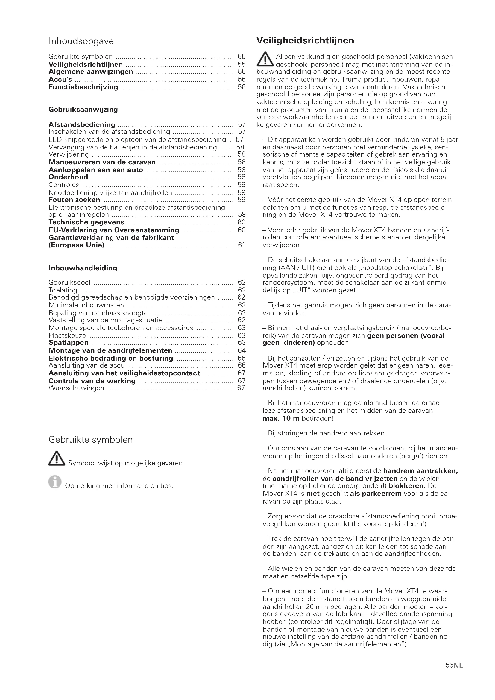 - Waarschuwingen Gebruikte symbolen Symbool wijst op mogelijke gevaren. Opmerking met informatie en tips.56 NL – De caravan mag niet onder de MoverXT4 worden opge- krikt, omdat dit tot beschadiging van de aandrijfeenheid kan leiden. – Gevoelige voorwerpen, zoals camera's, DVD-spelers enz. mogen niet in de bergruimte in de buurt van de besturing of van de motorbekabeling worden bewaard. Deze zouden schade kunnen oplopen door de sterke elektromagnetische velden. – Door het gewicht van de MoverXT4, wordt het ledig ge- wicht van het voertuig hoger, daardoor wordt de nuttige belasting van het voertuig minder. – Na het manoeuvreren de stekker / adapter uit het veilig- heidsstopcontact trekken, omdat anders de accu leeg raakt. Ruststroom bij ingestoken stekker / adapter < 80 mA. Rust- stroom bij uitgetrokken stekker / adapter < 150 µA. – Controleer het systeem alvorens dit te gaan gebruiken op beschadigingen. Als het systeem beschadigd is, mag het niet worden gebruikt. Algemene aanwijzingen De MoverXT4 is ontwikkeld voor hellingen tot ca. 10 % bij p. 67