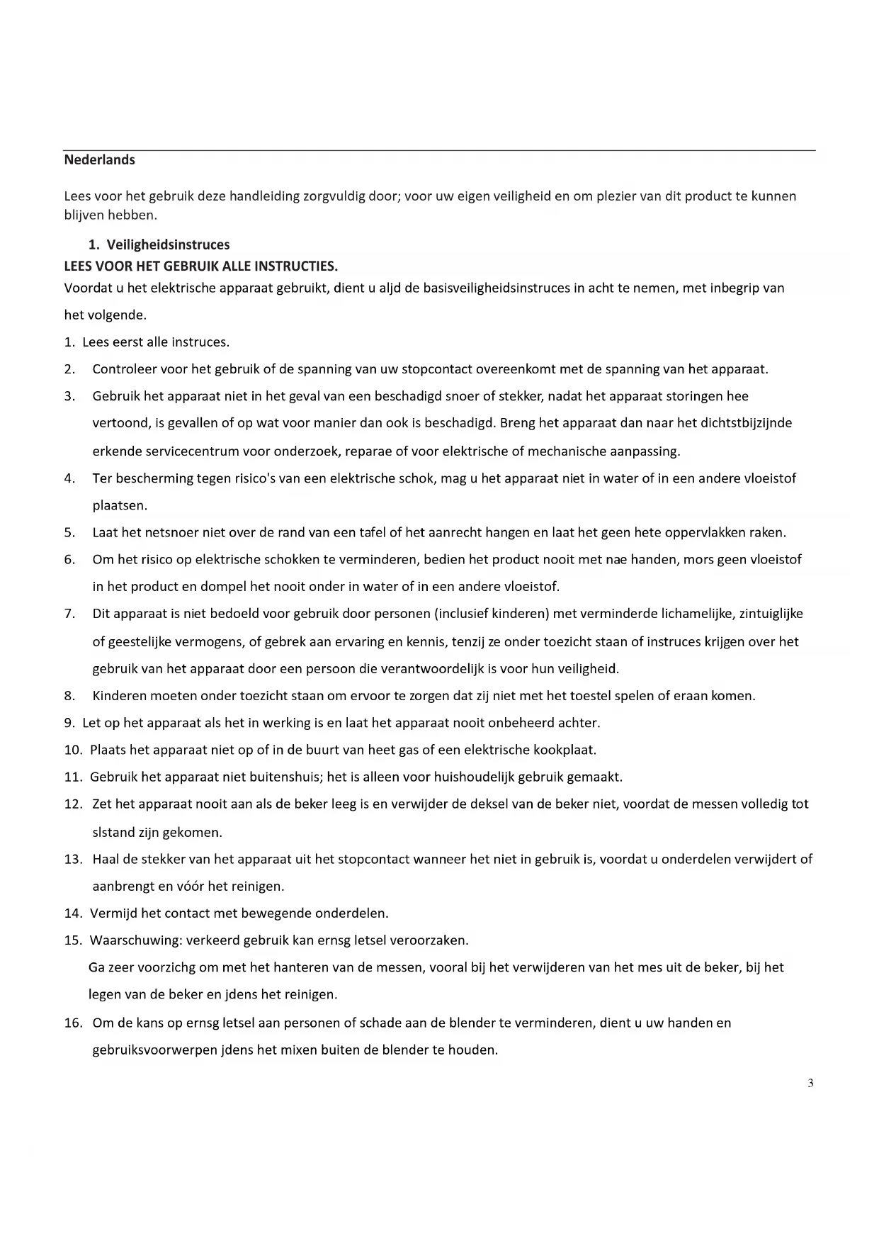 16. Om de kans op ernstig letsel aan personen of schade aan de blender te verminderen, dient u uw handen en