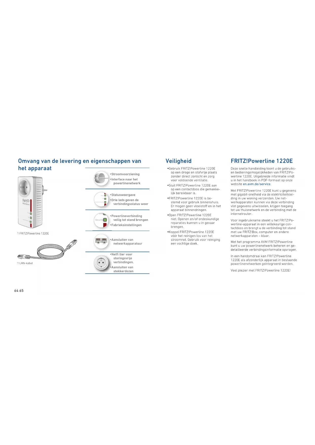- Aansluiten van stekkerdozen 1 FRITZ!Powerline1220E 1 LAN-kabel FRITZ!Powerline1220E Deze snelle handleiding toont u de gebruiks- en bedieningsmogelijkheden van FRITZ!Po- werline1220E. Uitgebreide informatie vindt u in het handboek in PDF-formaat op onze website en.avm.de/service. Met FRITZ!Powerline1220E kunt u gegevens met gigabit-snelheid via de elektriciteitslei- ding in uw woning verzenden. Uw net- werkapparaten kunnen via deze verbinding vlot gegevens uitwisselen, krijgen toegang tot uw thuisnetwerk en de verbinding met de internetrouter. Voor ingebruikname steekt u het FRITZ!Po- werline-apparaat in een willekeurige con- tactdoos en brengt u de verbinding tot stand met uw FRITZ!Box, computer en andere netwerkapparaten – klaar. Met het programma AVM FRITZ!Powerline kunt u uw powerlinenetwerk beheren en ge- detailleerde verbindingsinformatie opvragen. In een handomdraai kan FRITZ!Powerline 1220E als afzonderlijk apparaat in bestaande powerlinenetwerken geïntegreerd worden. Veel plezier met FRITZ!Powerline1220E! 64 65Fase (L) Nul (N) Aarde (PE) Aanvullende paar Standaard paar