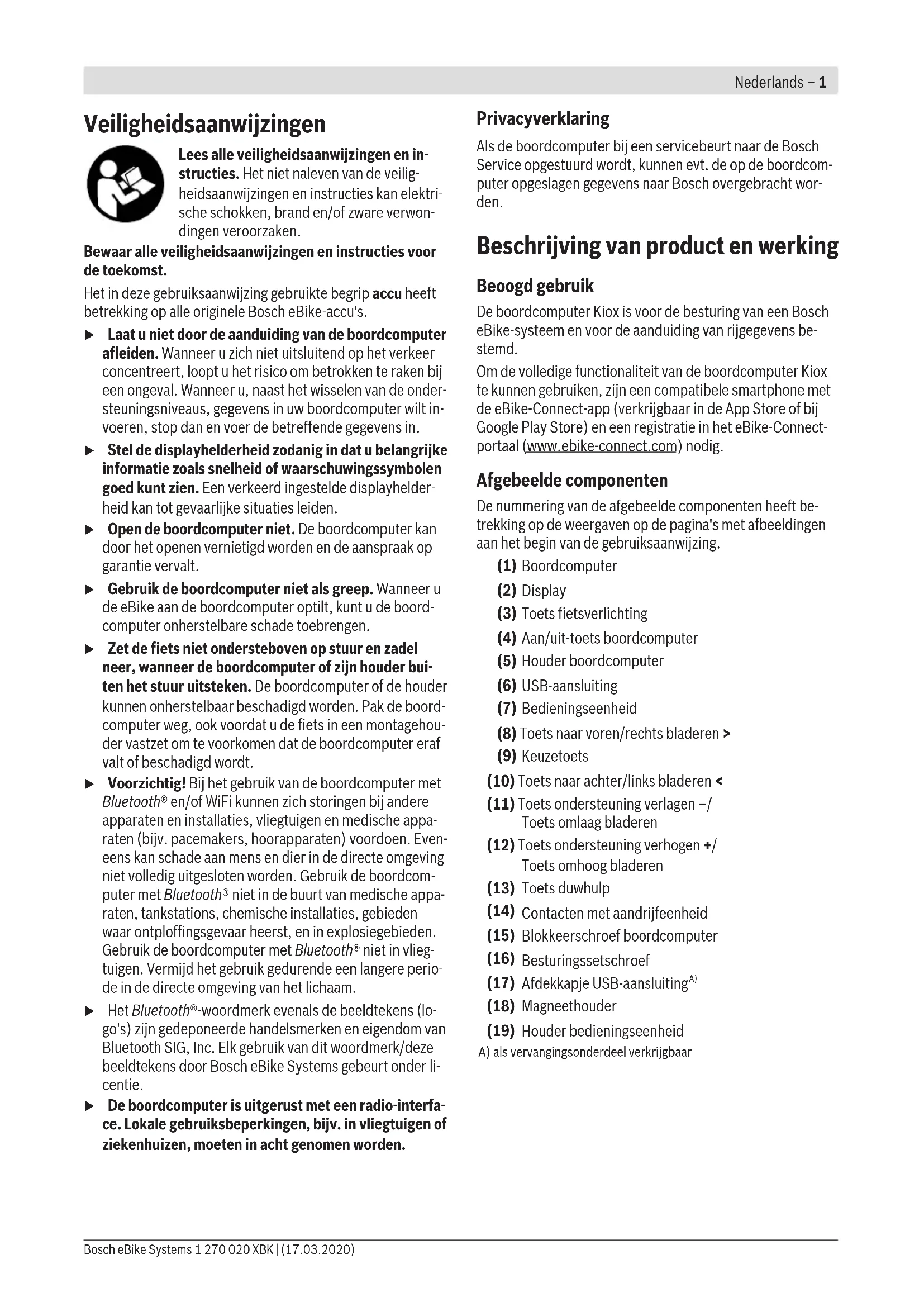 Errore di comunicazione Riavviare il sistema. Se il problema persiste, si prega di contattare il proprio rivenditore di eBike Bosch. 889 Errore interno all’ABS Si prega di contattare il proprio rivenditore di eBike Bosch. 890 Spia di controllo ABS difettosa o mancan- te; è possibile che l’ABS non sia operativo. Si prega di contattare il proprio rivenditore di eBike Bosch. Tutte le spie sono spente Errore interno al computer di bordo Riavviare il sistema eBike, disattivandolo e quindi riattivandolo. 1 270 020 XBK | (17.03.2020) Bosch eBike SystemsItaliano – 11 Manutenzione ed assistenza Manutenzione e pulizia Nessun componente andrà pulito con un’idropulitrice. Mantenere sempre pulito lo schermo del computer di bordo. In presenza di impurità, il rilevamento di luminosità potrebbe risultare non corretto. Per pulire il computer di bordo, utilizzare un panno morbido, inumidito esclusivamente con acqua. Non utilizzare alcun ti- po di detergente. Sottoporre a verifica tecnica il sistema eBike almeno una vol- ta all’anno (ad es. parte meccanica e grado di aggiornamento del software di sistema). Come ulteriore criterio per la scadenza di assistenza, il riven- ditore di biciclette può adottare una percorrenza e/o un las- so di tempo. In tale caso, una volta acceso, il computer di bordo informerà della scadenza. Per interventi di assistenza o riparazioni sull’eBike, rivolgersi ad un rivenditore di biciclette autorizzato. u Far eseguire tutte le riparazioni necessarie esclusiva- mente da un rivenditore di biciclette autorizzato. Servizio Assistenza Clienti e Consulenza Tecnica Per qualsiasi domanda riguardo al sistema eBike ed ai relati- vi componenti, rivolgersi ad un rivenditore di biciclette auto- rizzato. Per riferimenti di contatto dei rivenditori autorizzati di bici- clette, consultare il sito Internet www.bosch-ebike.com. Trasporto u Se si porta con sé l’eBike all’esterno dell’auto, ad es. su un portapacchi, prelevare il computer di bordo e la batteria per eBike, al fine di evitare danni. Smaltimento Propulsore, computer di bordo con relativa uni- tà di comando, batteria, sensore di velocità, ac- cessori ed imballaggi andranno avviati ad un ri- ciclaggio rispettoso dell’ambiente. Non gettare le eBikes, né i relativi componenti, nei rifiuti do- mestici. Conformemente alla direttiva europea 2012/19/UE, le apparecchiature elettroniche non più utilizzabili e, in base alla direttiva euro- pea 2006/66/CE, le batterie/le pile difettose o esauste, andranno raccolte separatamente ed avviate ad un riutilizzo rispettoso dell’ambien- te. I componenti per eBike Bosch andranno conferiti presso un rivenditore di biciclette autorizzato. Con riserva di modifiche tecniche. Bosch eBike Systems 1 270 020 XBK | (17.03.2020)Italiano – 12 1 270 020 XBK | (17.03.2020) Bosch eBike SystemsNederlands – 1 Veiligheidsaanwijzingen Lees alle veiligheidsaanwijzingen en in- structies. Het niet naleven van de veilig- heidsaanwijzingen en instructies kan elektri- sche schokken, brand en/of zware verwon- dingen veroorzaken. Bewaar alle veiligheidsaanwijzingen en instructies voor de toekomst. Het in deze gebruiksaanwijzing gebruikte begrip accu heeft betrekking op alle originele Bosch eBike-accu's. u Laat u niet door de aanduiding van de boordcomputer afleiden. Wanneer u zich niet uitsluitend op het verkeer concentreert, loopt u het risico om betrokken te raken bij een ongeval. Wanneer u, naast het wisselen van de onder- steuningsniveaus, gegevens in uw boordcomputer wilt in- voeren, stop dan en voer de betreffende gegevens in. u Stel de displayhelderheid zodanig in dat u belangrijke informatie zoals snelheid of waarschuwingssymbolen goed kunt zien. Een verkeerd ingestelde displayhelder- heid kan tot gevaarlijke situaties leiden. u Open de boordcomputer niet. De boordcomputer kan door het openen vernietigd worden en de aanspraak op garantie vervalt. u Gebruik de boordcomputer niet als greep. Wanneer u de eBike aan de boordcomputer optilt, kunt u de boord- computer onherstelbare schade toebrengen. u Zet de fiets niet ondersteboven op stuur en zadel neer, wanneer de boordcomputer of zijn houder bui- ten het stuur uitsteken. De boordcomputer of de houder kunnen onherstelbaar beschadigd worden. Pak de boord- computer weg, ook voordat u de fiets in een montagehou- der vastzet om te voorkomen dat de boordcomputer eraf valt of beschadigd wordt. u Voorzichtig! Bij het gebruik van de boordcomputer met Bluetooth® en/of WiFi kunnen zich storingen bij andere apparaten en installaties, vliegtuigen en medische appa- raten (bijv. pacemakers, hoorapparaten) voordoen. Even- eens kan schade aan mens en dier in de directe omgeving niet volledig uitgesloten worden. Gebruik de boordcom- puter met Bluetooth® niet in de buurt van medische appa- raten, tankstations, chemische installaties, gebieden waar ontploffingsgevaar heerst, en in explosiegebieden. Gebruik de boordcomputer met Bluetooth® niet in vlieg- tuigen. Vermijd het gebruik gedurende een langere perio- de in de directe omgeving van het lichaam. u Het Bluetooth®-woordmerk evenals de beeldtekens (lo- go's) zijn gedeponeerde handelsmerken en eigendom van Bluetooth SIG, Inc. Elk gebruik van dit woordmerk/deze beeldtekens door Bosch eBike Systems gebeurt onder li- centie. u De boordcomputer is uitgerust met een radio-interfa- ce. Lokale gebruiksbeperkingen, bijv. in vliegtuigen of ziekenhuizen, moeten in acht genomen worden. Privacyverklaring Als de boordcomputer bij een servicebeurt naar de Bosch Service opgestuurd wordt, kunnen evt. de op de boordcom- puter opgeslagen gegevens naar Bosch overgebracht wor- den. Beschrijving van product en werking Beoogd gebruik De boordcomputer Kiox is voor de besturing van een Bosch eBike-systeem en voor de aanduiding van rijgegevens be- stemd. Om de volledige functionaliteit van de boordcomputer Kiox te kunnen gebruiken, zijn een compatibele smartphone met de eBike-Connect-app (verkrijgbaar in de App Store of bij Googl