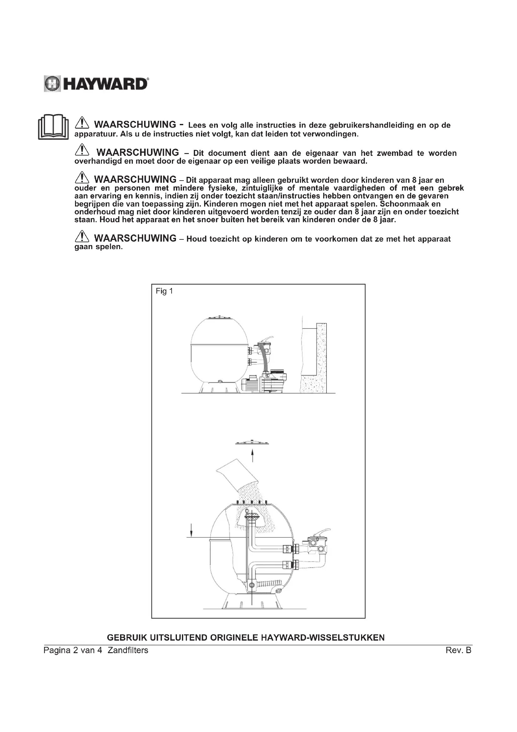WAARSCHUWING – Houd toezicht op kinderen om te voorkomen dat ze met het apparaat gaan spelen. Fig 1GEBRUIK UITSLUITEND ORIGINELE HAYWARD-WISSELSTUKKEN Pagina 3 van 4 Zandfilters Rev. B U hebt zojuist een zandfilter met voetstuk en klep gekocht. WERKING Uw filter gebruikt een speciaal soort zand dat bestemd is om het vuil dat in het water van uw zwembad zit tegen te houden. Het zand wordt in de tank gedaan en werkt als een permanent filtersysteem. Het ongefilterde zwembadwater met zwevende vuildeel- tjes erin wordt door de pomp aangezogen en naar de meerwegklep gestuurd. Het water loopt door het zand heen waardoor het vuil in het zandbed achterblijft. Het gefilterde water stroomt naar uw zwembad terug. PLAATSING