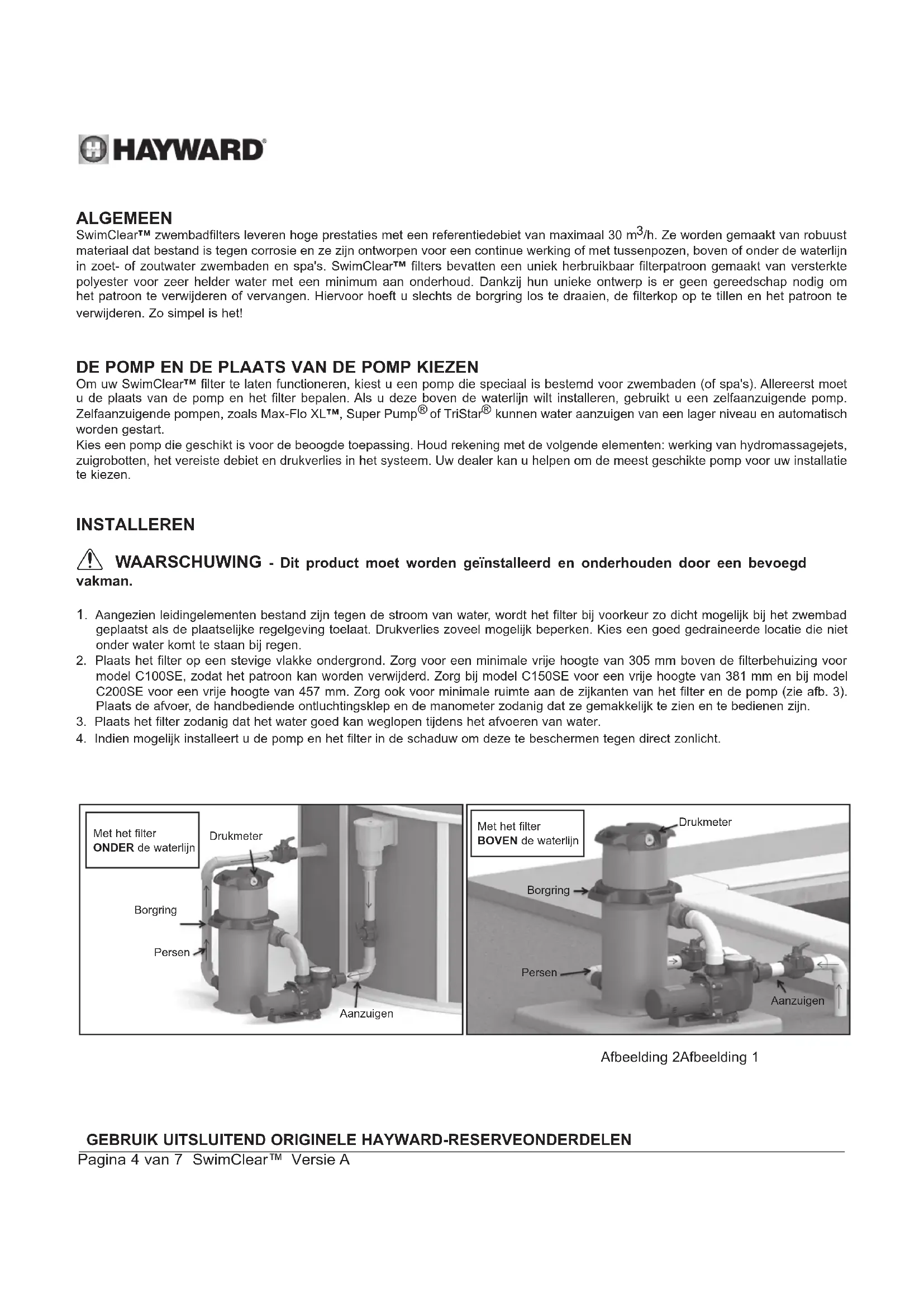- Verander de stand van de filterklep niet zolang de systeempomp in werking is. ⚠ WAARSCHUWING – Druktesten van de pomp en het filtersysteem boven 3,5 bar (50 PSI) kunnen leiden tot een plotselinge breuk van de onderdelen. Het breken van de onderdelen kan ernstig persoonlijk letsel of zelfs overlijden veroorzaken van de persoon die door loskomende onderdelen wordt geraakt.GEBRUIK UITSLUITEND ORIGINELE HAYWARD-RESERVEONDERDELEN Pagina 3 van 7 SwimClear™ Versie A Bedankt dat u voor Hayward gekozen hebt. Deze handleiding bevat belangrijke informatie over de werking en het onderhoud van uw product. Bewaar het voor toekomstig gebruik. OM UW PRODUCT IN ONZE DATABANK TE REGISTREREN, GAAT U NAAR: www.hayward.fr/en/services/register-your-product