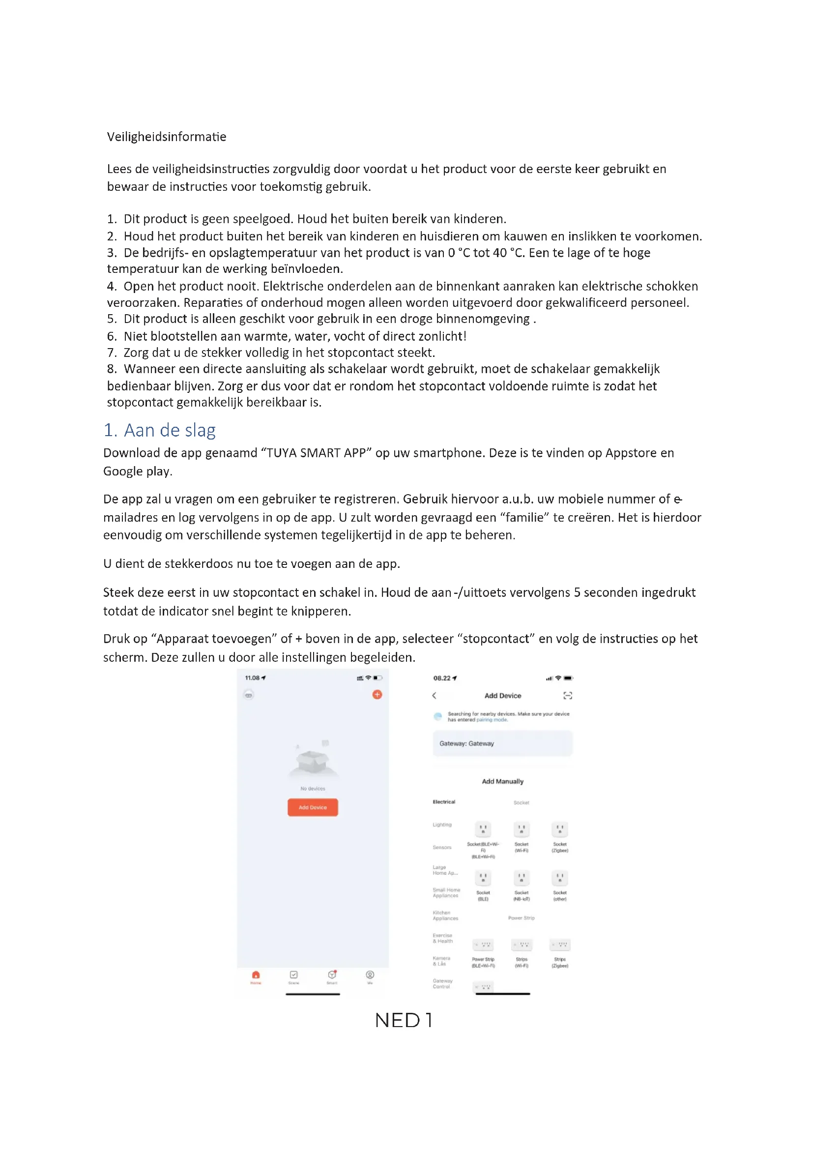 Download de app genaamd “TUYASMARTAPP” op uw smartphone. Deze is te vinden op Appstore en Google play. De app zal u vragen om een gebruiker te registreren. Gebruik hiervoor a.u.b. uw mobiele nummer of e- mailadres en log vervolgens in op de app. U zult worden gevraagd een “familie” te creëren. Het is hierdoor eenvoudig om verschillende systemen tegelijkerjd in de app te beheren. Udient de stekkerdoos nu toe te voegen aan de app. Steek deze eerst in uw stopcontact en schakel in. Houd de aan-/uioets vervolgens 5 seconden ingedrukt totdat de indicator snel begint te knipperen. Druk op “Apparaat toevoegen” of + boven in de app, selecteer “stopcontact” en volg de instruces op het scherm. Deze zullen u door alle instellingen begeleiden. NED 12. Dagelijks gebruik Uzult uw stekkerdoos nu aantreffen op de homepagina van de app. Druk hierop en u zult naar de stekkerpagina worden gebracht. U kunt het apparaat hier inschakelen en uitschakelen, mers instellen, enz.