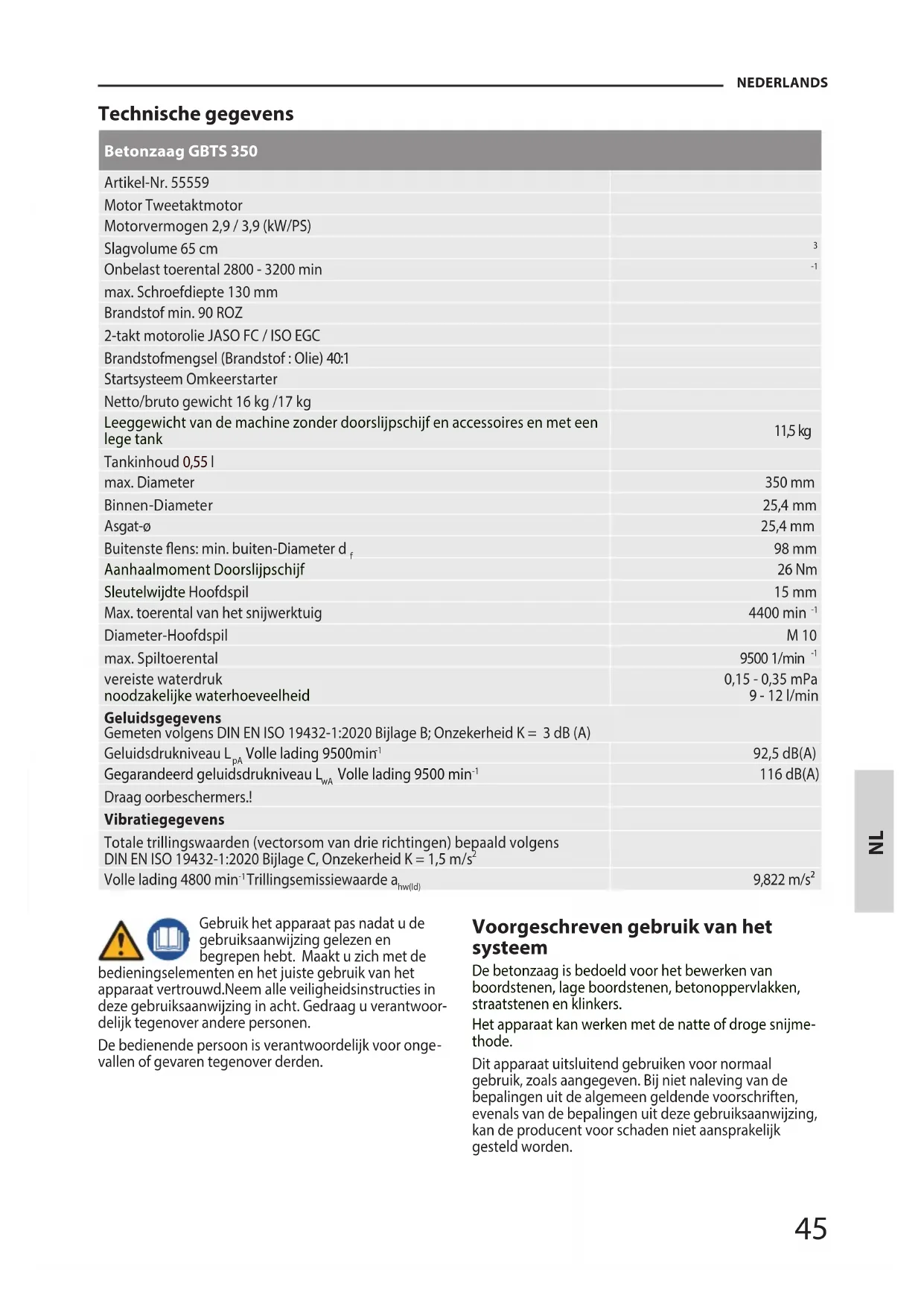 max. Schroefdiepte 130 mm Brandstof min. 90 ROZ 2-takt motorolie JASO FC / ISO EGC Brandstofmengsel (Brandstof : Olie) 40:1 Startsysteem Omkeerstarter Netto/bruto gewicht 16 kg /17 kg Leeggewicht van de machine zonder doorslijpschijf en accessoires en met een lege tank 11,5 kg Tankinhoud 0,55 l max. Diameter 350 mm Binnen-Diameter 25,4 mm Asgat-ø 25,4 mm Buitenste ens: min. buiten-Diameter d