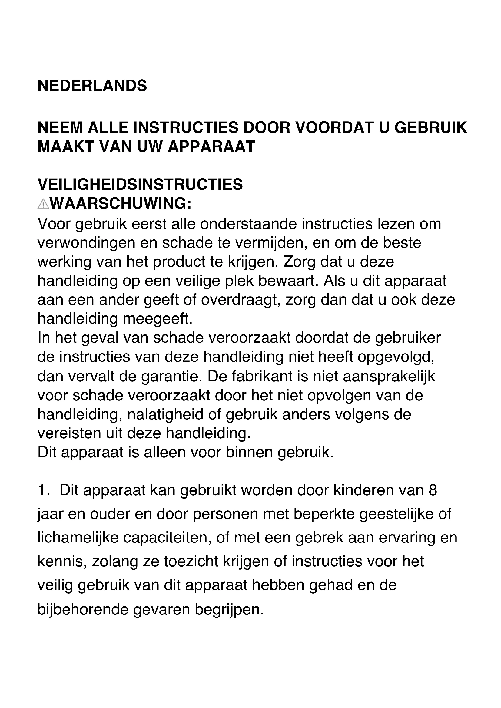 VEILIGHEIDSINSTRUCTIES WAARSCHUWING: Voor gebruik eerst alle onderstaande instructies lezen om verwondingen en schade te vermijden, en om de beste werking van het product te krijgen. Zorg dat u deze handleiding op een veilige plek bewaart. Als u dit apparaat aan een ander geeft of overdraagt, zorg dan dat u ook deze handleiding meegeeft. In het geval van schade veroorzaakt doordat de gebruiker de instructies van deze handleiding niet heeft opgevolgd, dan vervalt de garantie. De fabrikant is niet aansprakelijk voor schade veroorzaakt door het niet opvolgen van de handleiding, nalatigheid of gebruik anders volgens de vereisten uit deze handleiding. Dit apparaat is alleen voor binnen gebruik.