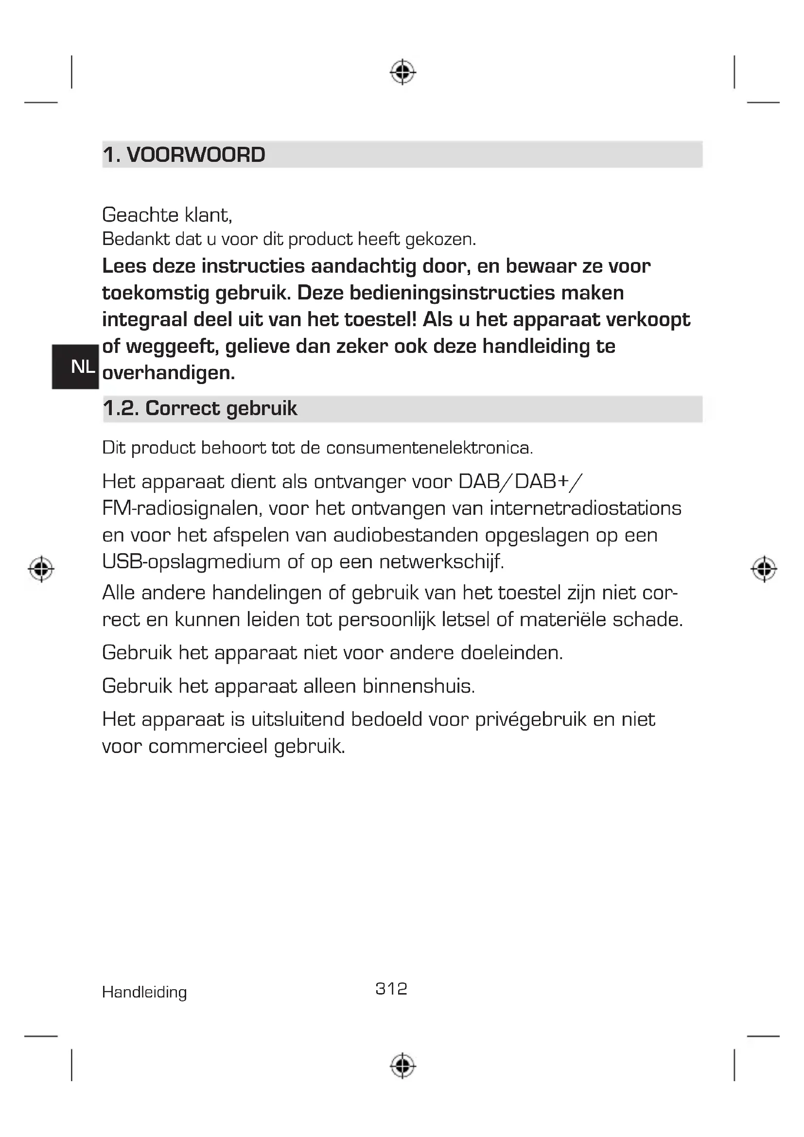 Handleiding Geachte klant, Bedankt dat u voor dit product heeft gekozen. Lees deze instructies aandachtig door, en bewaar ze voor toekomstig gebruik. Deze bedieningsinstructies maken integraal deel uit van het toestel! Als u het apparaat verkoopt of weggeeft, gelieve dan zeker ook deze handleiding te overhandigen. 1.2. Correct gebruik Dit product behoort tot de consumentenelektronica. Het apparaat dient als ontvanger voor DAB/DAB+/ FM-radiosignalen, voor het ontvangen van internetradiostations en voor het afspelen van audiobestanden opgeslagen op een USB-opslagmedium of op een netwerkschijf. Alle andere handelingen of gebruik van het toestel zijn niet cor- rect en kunnen leiden tot persoonlijk letsel of materiële schade. Gebruik het apparaat niet voor andere doeleinden. Gebruik het apparaat alleen binnenshuis. Het apparaat is uitsluitend bedoeld voor privégebruik en niet voor commercieel gebruik.