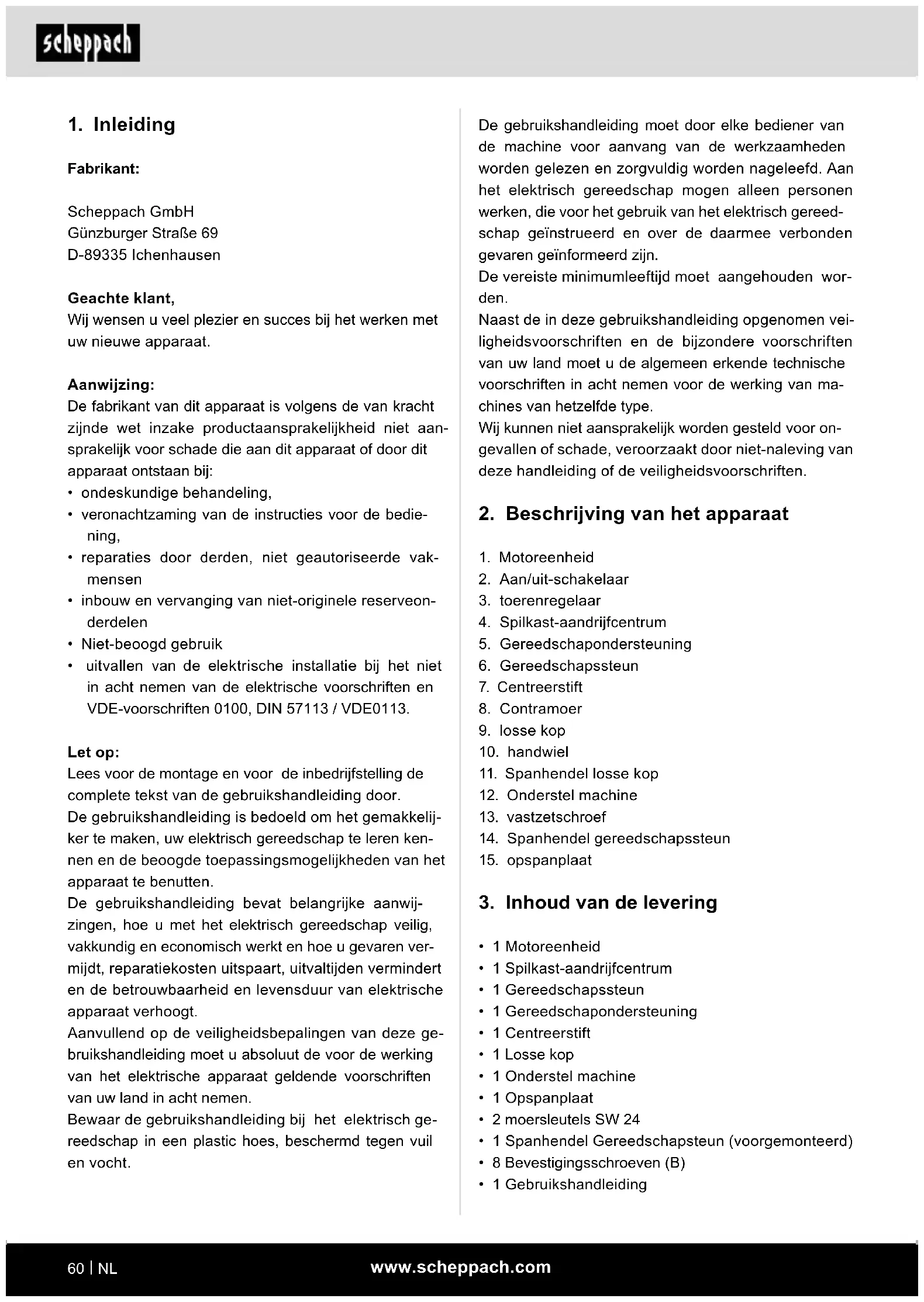 Fabrikant: Scheppach GmbH Günzburger Straße 69 D-89335 Ichenhausen Geachte klant, Wij wensen u veel plezier en succes bij het werken met uw nieuwe apparaat. Aanwijzing: De fabrikant van dit apparaat is volgens de van kracht zijnde wet inzake productaansprakelijkheid niet aan- sprakelijk voor schade die aan dit apparaat of door dit apparaat ontstaan bij: