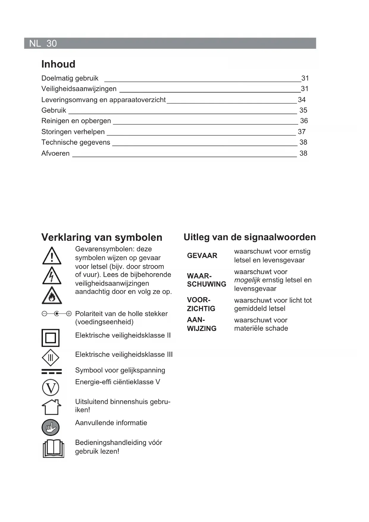 - Alle gebreken die zijn ontstaan door ondeskundige behandeling, beschadiging of re- paratiepogingen, zijn uitgesloten van garantie. Dit geldt ook voor de normale slijtage. Veiligheidsaanwijzingen ■ De stroomtoevoer naar het apparaat moet worden onderbroken als het niet onder toezicht staat en voordat het wordt gereinigd. ■ Het apparaat is niet bedoeld voor gebruik door personen (inclu- sief kinderen) met beperkte sensorische of geestelijke vermo- gens of met een gebrek aan ervaring en/of gebrek aan kennis, tenzij een persoon die verantwoordelijk is voor hun veiligheid, toezicht op hen houdt of hen instructies heeft gegeven over hoe het apparaat moet worden gebruikt. ■ Kinderen moeten onder toezicht staan om ervoor te zorgen dat zij niet met het apparaat spelen. ■ Het apparaat beschikt over een verwarmingsfunctie. Personen die ongevoelig zijn voor hitte, moeten voorzichtig zijn met het gebruik van de verwarmingsfunctie. ■ Houd scherpe en puntige voorwerpen uit de buurt van het appa- raat zodat het niet beschadigd raakt.NL 32 ■ Controleer het apparaat in het belang van uw eigen veiligheid vóór elke ingebruikname op beschadigingen. Alleen gebruiken wanneer het geen schade vertoont! ■ Wanneer het apparaat, het netsnoer of de voedingseenheid van het apparaat zijn beschadigd, dan moeten deze door de fabri- kant of klantenservice of een soortgelijk gekwalifi ceerde per- soon (bijv. gespecialiseerde werkplaats) worden vervangen, om gevaren te voorkomen. Gezondheidsspecifi eke aanwijzingen ■ Het apparaat alleen gebruiken, wanneer er geen sprake is van fysieke aandoe- ningen of klachten. ■ De volgende personen mogen het apparaat uitsluitend na overleg met een arts gebruiken: – Dragers van een pacemaker of soortgelijke medische implantaten; – Personen met hartaandoeningen of personen die aan epilepsie lijden; – Personen met aandoeningen aan de rug of ruggengraat; – Personen die aan osteomyelitis, infecties van het bot (in het bijzonder bij bescha- diging van de ruggengraat) of aan osteoporose lijden; – Zwangeren of vrouwen die kort geleden hebben gebaard; – Personen die aan doorbloedingsstoornissen of trombose lijden; – Personen die een operatie hebben ondergaan, waarvan de behandeling nog niet is afgesloten; – Personen met lichamelijke afwijkingen, – Personen die een kwaadaardig gezwel hebben. ■ Als u onzeker bent of het apparaat mag worden gebruikt, met een verantwoordelijk arts overleg voeren. ■ Gebruik het apparaat niet in de buurt van resp. op verwondingen, zwellingen, hui- dirritaties, ontstoken huid, wratten, schimmelinfecties, een op een ziekte duidende verandering van de huid of gevoelloze lichaamsdelen. ■ Het apparaat mag niet langer dan 30 minuten achtereen worden gebruikt. Masseer een bepaalde spiergroep niet langer dan 15 minuten. ■ Treedt tijdens het gebruik van het apparaat een onaangenaam gevoel op, de mas- sage direct staken! ■ Tijdens het gebruik van het apparaat niet in slaap vallen! ■ Het apparaat dient niet te worden gebruikt alvorens men gaat slapen. De massage heeft een stimulerende werking, hetgeen eventueel kan leiden tot problemen bij het inslapen. GEVAAR – Gevaar voor een elektrische schok door water! ■ Uitsluitend in gesloten ruimten gebruiken en bewaren. ■ Niet gebruiken in ruimten met een hoge luchtvochtigheid.33 NL ■ Dompel het apparaat, het netsnoer en de voedingseenheid nooit in water of andere vloeistoffen, en zorg ervoor dat deze niet in het water kunnen vallen of nat kunnen worden. ■ Mocht het apparaat in het water vallen, onderbreekt u meteen de stroomtoevoer. Probeer niet om het apparaat uit het water te trekken, terwijl het is aangesloten op het stroomnet! ■ Raak het apparaat, het netsnoer en de voedingseenheid nooit aan met vochtige han- den wanneer deze onderdelen zijn aangesloten op het stroomnet. ■ Nooit vloeistoffen opzuigen. Vul het stofreservoir niet met vloeistoffen. Houd het mo- torblok uit de buurt van vocht of natheid! WAARSCHUWING – Gevaar voor een elektrische schok door schade en ondeskundig gebruik! ■ De voedingseenheid alleen aansluiten op een contactdoos met aardingscontacten die overeenstemmen met de technische gegevens van het apparaat. De contact- doos moet ook na het aansluiten goed toegankelijk zijn, zodat de verbinding met het stroomnet snel kan worden onderbroken. ■ Gebruik alleen correct werkende verlengsnoeren, waarvan de technische gegevens overeenstemmen met die van het apparaat. ■ Het apparaat bij schade / storingen (bijv. ongewone geluiden, geur- of rookontwikke- ling) alsook bij onweer direct uitschakelen en de voedingseenheid uit de contactdoos trekken. ■ Het apparaat moet zijn uitgeschakeld, wanneer u de voedingseenheid uit de con- tactdoos trekt of erin steekt. Trek altijd aan de voedingseenheid en nooit aan het netsnoer om het apparaat van het stroomnet te ontkoppelen. WAARSCHUWING – Verwondingsgevaar! ■ Wurgingsgevaar! Zorg ervoor dat het netsnoer steeds buiten bereik is van kleine kinderen en dieren. ■ Het apparaat alleen buiten bereik van kinderen en dieren gebruiken en bewaren. Ook het netsnoer mag voor kinderen en dieren niet bereikbaar zijn. Zij zouden het apparaat eraan omlaag kunnen trekken. ■ Gevaar op verbrandingen door bijtende stoffen! Batterijen kunnen bij het inslik- ken levensgevaarlijk zijn. Bewaar de batterijen en de afstandsbediening daarom op een voor kleine kinderen ontoegankelijke plaats. Werd een batterij ingeslikt, dan moet meteen medische hulp worden ingeschakeld. ■ Gevaar op verbrandingen door bijtende stoffen! Als de accu / de batterijen heeft / hebben gelekt, dient u te voorkomen dat huid, ogen en slijmvliezen in contact komen met het batterijzuur. Bij contact met batterijzuur moet u de desbetreffende plaatsen direct met veel schoon water spoelen en onmiddellijk een arts raadplegen. ■ Steek geen vingers of andere lichaamsdelen in het apparaat. Open de ritssluiting niet tijdens het gebruik. ■ Risico op omvallen! L