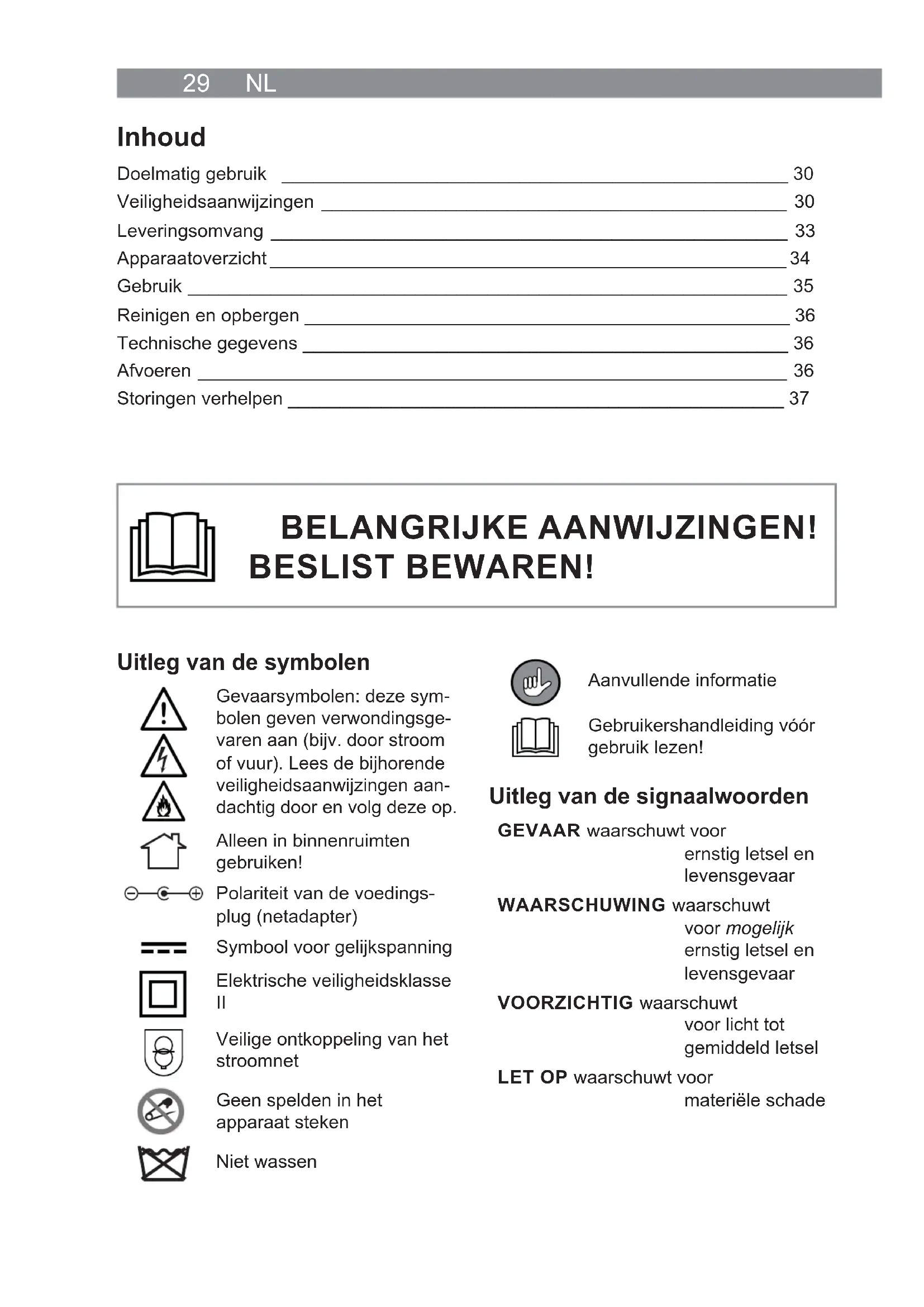 Veilige ontkoppeling van het stroomnet Geen spelden in het apparaat steken Niet wassen Aanvullende informatie Gebruikershandleiding vóór gebruik lezen! Uitleg van de signaalwoorden GEVAAR waarschuwt voor ernstig letsel en levensgevaar WAARSCHUWING waarschuwt voor mogelijk ernstig letsel en levensgevaar VOORZICHTIG waarschuwt voor licht tot gemiddeld letsel LET OP waarschuwt voor materiële schade BELANGRIJKE AANWIJZINGEN!