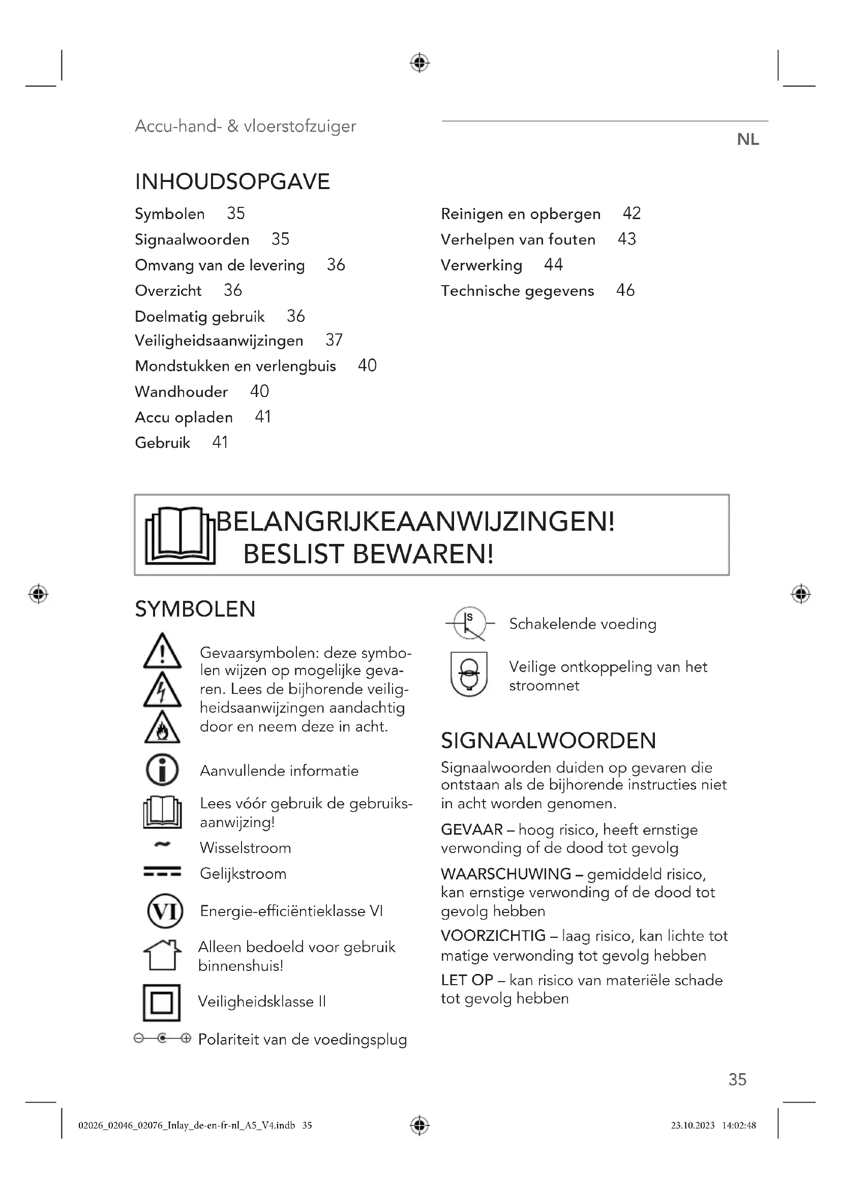INHOUDSOPGAVE Symbolen 35 Signaalwoorden 35 Omvang van de levering 36 Overzicht 36 Doelmatig gebruik 36 Veiligheidsaanwijzingen 37 Mondstukken en verlengbuis 40 Wandhouder 40 Accu opladen 41 Gebruik 41 Reinigen en opbergen 42 Verhelpen van fouten 43 Verwerking 44 Technische gegevens 46 SYMBOLEN Gevaarsymbolen: deze symbo- len wijzen op mogelijke geva- ren. Lees de bijhorende veilig- heidsaanwijzingen aandachtig door en neem deze in acht. Aanvullende informatie Lees vóór gebruik de gebruiks- aanwijzing! Wisselstroom Gelijkstroom Energie-efficiëntieklasse VI Alleen bedoeld voor gebruik binnenshuis! Veiligheidsklasse II Polariteit van de voedingsplug