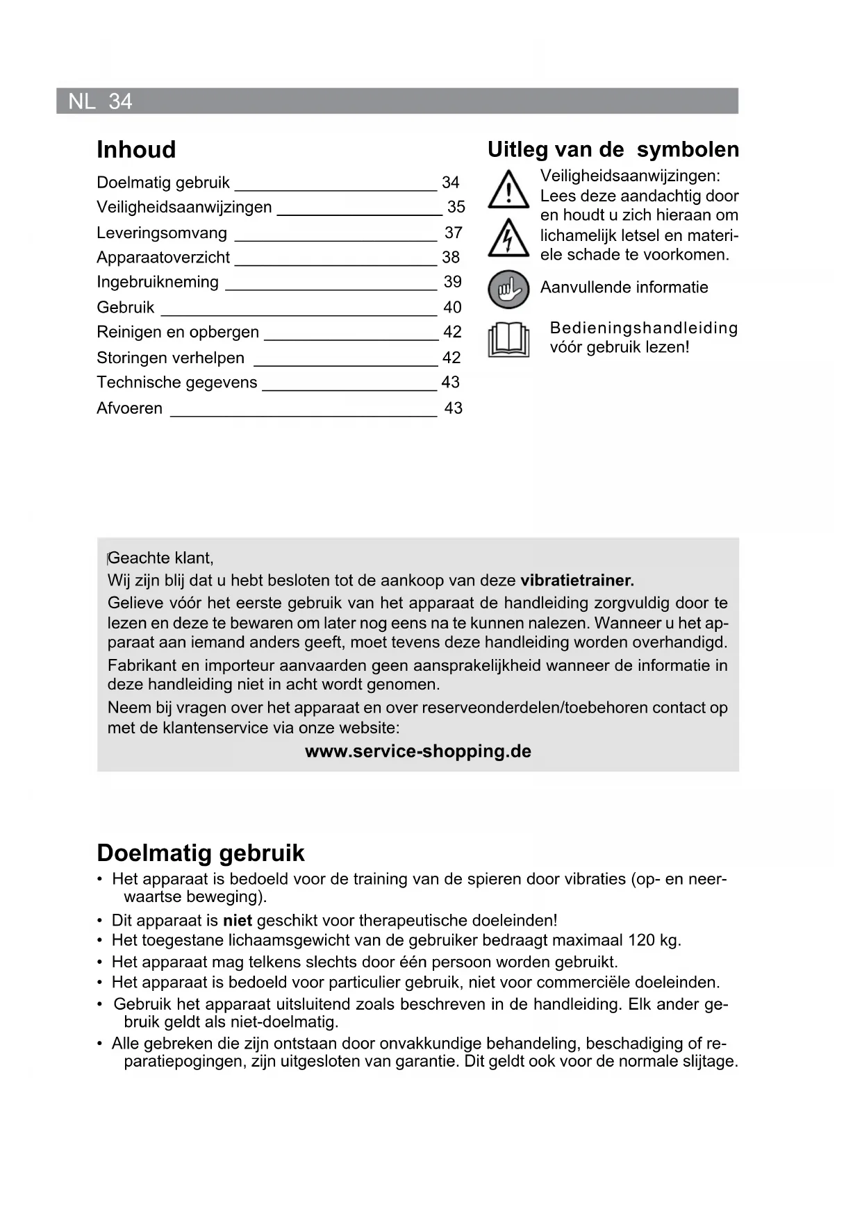 - Alle gebreken die zijn ontstaan door onvakkundige behandeling, beschadiging of re- paratiepogingen, zijn uitgesloten van garantie. Dit geldt ook voor de normale slijtage. Uitleg van de symbolen Veiligheidsaanwijzingen: Lees deze aandachtig door en houdt u zich hieraan om lichamelijk letsel en materi- ele schade te voorkomen. Aanvullende informatie Bedieningshandleiding vóór gebruik lezen! Geachte klant, Wij zijn blij dat u hebt besloten tot de aankoop van deze vibratietrainer. Gelieve vóór het eerste gebruik van het apparaat de handleiding zorgvuldig door te lezen en deze te bewaren om later nog eens na te kunnen nalezen. Wanneer u het ap- paraat aan iemand anders geeft, moet tevens deze handleiding worden overhandigd. Fabrikant en importeur aanvaarden geen aansprakelijkheid wanneer de informatie in deze handleiding niet in acht wordt genomen. Neem bij vragen over het apparaat en over reserveonderdelen/toebehoren contact op met de klantenservice via onze website: www.service-shopping.de Inhoud Doelmatig gebruik ______________________ 34 Veiligheidsaanwijzingen __________________ 35 Leveringsomvang ______________________ 37 Apparaatoverzicht ______________________ 38 Ingebruikneming _______________________ 39 Gebruik ______________________________ 40 Reinigen en opbergen ___________________ 42 Storingen verhelpen ____________________ 42 Technische gegevens ___________________ 43 Afvoeren _____________________________ 4335 NL Veiligheidsaanwijzingen ■ Dit apparaat kan worden gebruikt door kinderen vanaf 8 jaar alsook door personen met beperkte lichamelijke, sensorische of geestelijke vermogens of onvoldoende ervaring en/of kennis, wanneer zij onder toezicht staan en instructies hebben gekre- gen over hoe het apparaat op veilige wijze kan worden gebruikt en wanneer zij de daaruit voortvloeiende gevaren hebben be- grepen. ■ Kinderen mogen niet spelen met het apparaat. ■ Reiniging en gebruikersonderhoud mogen zonder toezicht niet worden uitgevoerd door kinderen. ■ Kinderen jonger dan 8 jaar en dieren moeten uit de buurt wor- den gehouden van het apparaat en het netsnoer. ■ Wanneer het apparaat niet onder toezicht staat, en vóór het mon- teren, demonteren of reinigen moet het altijd van het stroomnet worden geïsoleerd. ■ Wanneer de netaansluiting van dit apparaat wordt beschadigd, moet deze door een speciale aansluitsnoer worden vervangen die verkrijgbaar is bij de fabrikant of diens klantenservice. ■ Breng geen veranderingen aan het apparaat aan. Wanneer het apparaat is beschadigd, dan moet deze door de fabrikant of klantenservice of een soortgelijk gekwalifi ceerde persoon (bijv. gespecialiseerde werkplaats) worden vervangen, om gevaren te voorkomen. Gevaar voor verwondingen ■ Houd kinderen en dieren uit de buurt van de verpakkingsfolie. Er bestaat verstik- kingsgevaar! ■ Let erop dat niemand kan struikelen over het aangesloten netsnoer. ■ Wanneer u met betrekking tot uw gezondheid tot een risicogroep behoort of wanneer u langere tijd niet aan sport hebt gedaan, evenwichts-, circulatie- of orthopedische problemen hebt, dient u uw arts te raadplegen alvorens het apparaat te gebruiken. Bespreek het trainingsprogramma eventueel met hem. ■ Gebruik het apparaat niet als u onlangs met botbreuken te maken hebt gehad of nog niet genezen operatielittekens hebt. ■ Gebruik het apparaat niet bij aderontstekingen, trombose, gezwellen of acute ontste- kingen. Raadpleeg uw arts of een toepassing voor u onbedenkelijk is. ■ Zwangere vrouwen mogen het apparaat niet resp. alleen gebruiken na overleg met hun arts.NL 36 ■ Begin met de langzaamste vibratiestand en verhoog geleidelijk de intensiteit. Wij maken u er uitdrukkelijk op attent dat ondeskundig gebruik van het apparaat en over- matige training schadelijk kan zijn voor de gezondheid. ■ LET OP! Onderbreek de toepassing direct, wanneer u zich zwak of duizelig voelt. Bij misselijkheid, pijn op de borst of in de gewrichten, hartkloppingen of andere sympto- men dient u zich onmiddellijk tot een arts te wenden. ■ Zorg voor elke ingebruikneming dat er voldoende vrije ruimte om het apparaat is, zodat u tijdens de training niet kunt stoten tegen muren, meubelen etc. ■ Het apparaat mag telkens slechts door één persoon worden gebruikt. Gevaar van elektrische schokken en brand ■ Houd het apparaat, de netaansluiting en de afstandsbediening uit de buurt van water of andere vloeistoffen, om elektrische schokken te voorkomen. Raak deze onderde- len nooit aan met natte resp. vochtige handen. Mocht het apparaat in het water val- len, onderbreek dan meteen de stroomtoevoer. Probeer niet om het apparaat uit het water te trekken wanneer het is aangesloten op het stroomnet! ■ Gebruik en berg het apparaat alleen op in gesloten ruimten. Gebruik het niet in de openlucht, in ruimten met een hoge luchtvochtigheid of op hete oppervlakken. ■ Gebruik het apparaat niet wanneer er licht ontvlambare gassen in de lucht aanwezig zijn. Gebruik het apparaat nooit in de buurt van een gasbron. ■ Zet het apparaat uitsluitend op een droge, vlakke en vaste ondergrond. Wanneer u het apparaat op een tapijt gebruikt, dient u erop te letten dat de ventilatieopeningen aan de onderkant van het apparaat vrij blijven. ■ Let erop dat het netsnoer niet bekneld raakt, geknikt wordt of op scherpe randen wordt gelegd, en dat het niet in aanraking komt met hete oppervlakken. ■ Sluit het netsnoer alleen aan op een contactdoos die is geïnstalleerd volgens de voorschriften. De contactdoos moet ook na het aansluiten goed toegankelijk zijn. De netspanning moet overeenstemmen met de technische gegevens van het typeplaatje op het apparaat. Gebruik alleen correct werkende verlengsnoeren, waarvan de tech- nische gegevens overeenstemmen met die van het apparaat. ■ Schakel het apparaat uit en trek de netstekker uit de contactdoos, wanneer tijdens het gebruik een storing optreedt of vóór een onweersbui. ■ Trek, als u de netadapter uit de contactdoos wilt trek