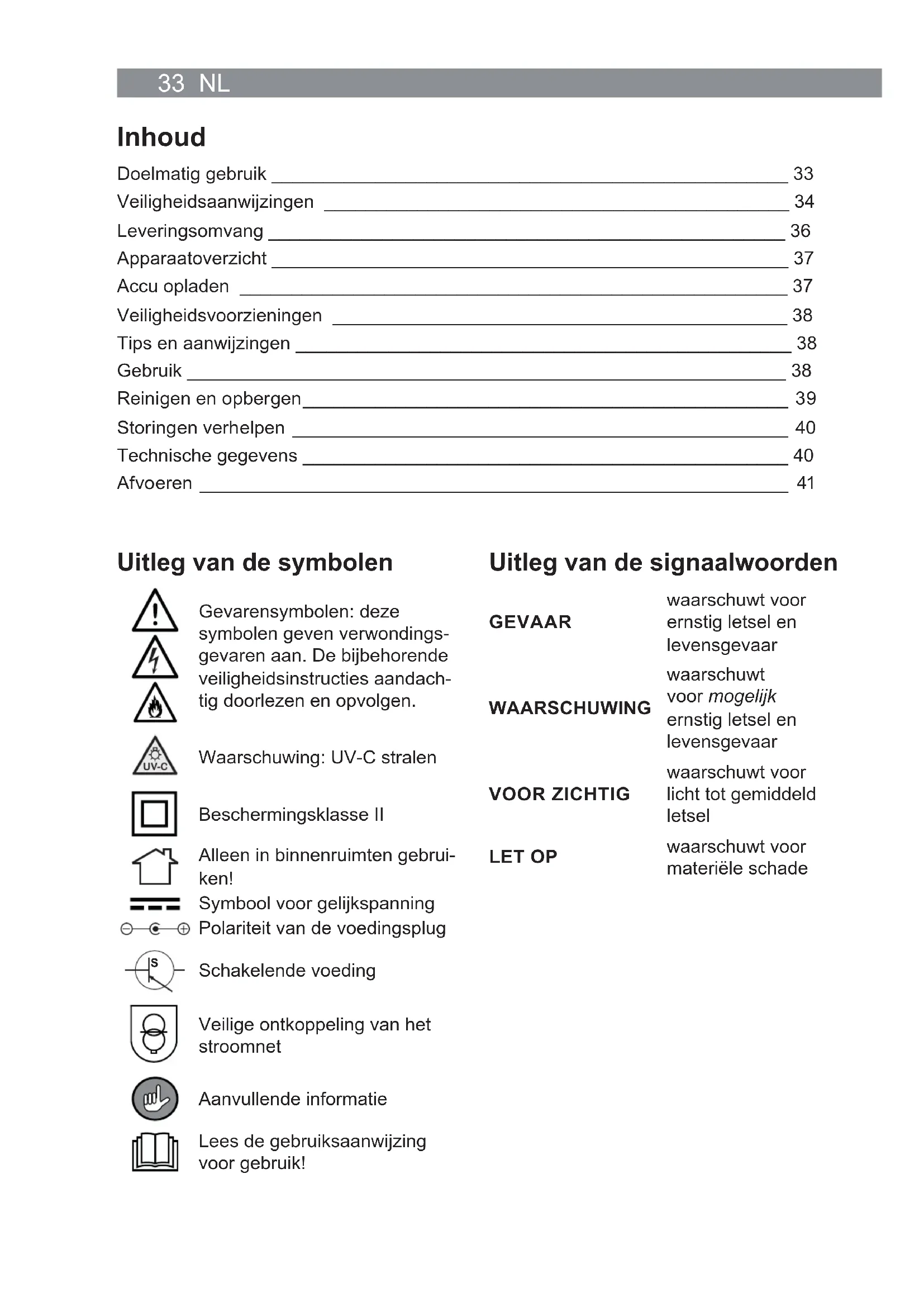 Veiligheidsaanwijzingen WAARSCHUWING: alle veiligheidsaanwijzingen, aanwij- zingen, afbeeldingen en technische gegevens die zijn aangebracht op dit apparaat, lezen. Nalatigheid bij het na- leven van de veiligheidsinstructies en aanwijzingen kan een elektrische schok, brand en / of letsel tot gevolg hebben. ■ Dit apparaat mag niet worden gebruikt door kinderen. Het ap- paraat en de elektrische leiding moeten uit de buurt worden ge- houden van kinderen. ■ Dit apparaat kan worden gebruikt door personen met beperkte lichamelijke, sensorische of geestelijke vermogens of kinderen die niet beschikken over ervaring en / of kennis, wanneer zij on- der toezicht staan en instructies hebben gekregen over hoe het apparaat op veilige wijze kan worden gebruikt en wanneer zij de daaruit voortvloeiende gevaren hebben begrepen. Kinderen mogen niet met het apparaat spelen. ■ Het apparaat moet altijd worden uitgeschakeld als het niet on- der toezicht staat en voordat het wordt gemonteerd, gedemon- teerd of gereinigd. ■ De accu uitsluitend opladen met de meegeleverde netvoeding. Met de meegeleverde netvoeding geen andere apparaten op- laden. ■ Dompel het apparaat en de elektrische leiding nooit in water of andere vloeistoff en, en zorg ervoor dat deze niet in het water kunnen vallen of nat kunnen worden. ■ Controleer het apparaat in het belang van uw eigen veiligheid vóór elke ingebruikname op beschadigingen. Alleen gebruiken wanneer het apparaat geen schade vertoont! Wanneer het ap- paraat of de elektrische leiding van het apparaat is beschadigd, dan moeten deze door de fabrikant, klantenservice of een soort- gelijk gekwalifi ceerde persoon (bijv. gespecialiseerde werk- plaats) worden vervangen, om gevaren te voorkomen.NL 36 GEVAAR – Gevaar voor een elektrische schok ■ Uitsluitend in gesloten ruimten gebruiken en bewaren. ■ Niet gebruiken in ruimten met een hoge luchtvochtigheid. ■ Mocht het apparaat tijdens het opladen in het water vallen, onderbreekt u meteen de stroomtoevoer. Probeer niet om het apparaat uit het water te trekken, terwijl het is aangesloten op het stroomnet! ■ Raak het apparaat en de elektrische leiding nooit aan met vochtige handen wanneer deze onderdelen zijn aangesloten op het stroomnet. ■ Nooit vloeistoff en opzuigen. Vul het stofreservoir niet met vloeistoff en. Houd het motorblok uit de buurt van vocht of natheid! ■ Wanneer u het apparaat als handstofzuiger wilt gebruiken om een auto schoon te zuigen, let er dan op dat het apparaat niet wordt blootgesteld aan regen of vocht. WAARSCHUWING – Gevaar voor schade aan ogen en huid! ■ Germicide ultraviolette stralen zijn schadelijk voor de ogen en de huid. U mag uzelf resp. andere personen en dieren nooit blootstellen aan directe of refl ecterende stra- len! In geval van contact met de stralen direct een arts opzoeken. ■ Erop letten dat de veiligheidsschakelaars van de UV-C-lamp niet worden geblok- keerd! WAARSCHUWING – Verwondingsgevaar ■ Verstikkingsgevaar! Houd kinderen en dieren uit de buurt van het verpakkings- materiaal. ■ Gevaar door wurging! Zorg ervoor dat de elektrische leiding steeds buiten bereik is van kleine kinderen en dieren. ■ Gevaar voor verwonding door etsende werking! Als de accu heeft gelekt, dient u te voorkomen dat huid, ogen en slijmvliezen in contact komen met het batterijzuur. Bij contact met batterijzuur moet u de getroff en plaatsen direct met veel schoon water uitspoelen en onmiddellijk medische hulp inschakelen. ■ Gevaar van vastzuigen! Houd dieren, haren, sieraden, wijde kleding, vingers en alle overige lichaamsdelen uit de buurt van de zuigopening van het apparaat. De stof- zuiger zou zich kunnen vastzuigen. Mocht de stofzuiger zich toch eens vastzuigen, schakel dan het apparaat direct uit. ■ Valgevaar! Zorg ervoor dat niemand kan struikelen over de elektrische leiding. WAARSCHUWING – Brandgevaar ■ Gebruik het apparaat niet in ruimten, waarin zich licht ontvlambare substanties of giftige en explosieve dampen bevinden. ■ Laad het apparaat niet op in de buurt van licht ontvlambare materialen (gordijnen, textiel etc.). ■ Dek het apparaat tijdens het bedrijf en opladen niet af, om ontbranden van het appa- raat te voorkomen. Niets in de ventilatieopeningen van het apparaat steken en erop letten dat deze niet zijn verstopt.37 NL LET OP – Gevaar voor materiële schade ■ Het apparaat alleen aansluiten op een contactdoos die overeenstemmen met de technische gegevens van het apparaat. De contactdoos moet ook na het aansluiten goed toegankelijk zijn, zodat de verbinding met het stroomnet snel kan worden on- derbroken. ■ Let op dat de elektrische leiding niet bekneld raakt, geknikt of over scherpe randen gelegd wordt en dat het niet in aanraking komt met hete oppervlakken. De elektrische leiding niet om het apparaat wikkelen (gevaar van kabelbreuk). ■ Trek in geval van een fout tijdens het opladen of vóór een onweersbui de netvoeding uit de contactdoos. ■ Bij het eruit trekken uit de contactdoos altijd aan de netvoeding en nooit aan het net- snoer trekken! Trek of draag het apparaat nooit aan het netsnoer. ■ Bescherm het apparaat tegen hitte, open vuur, temperaturen onder nul, lang aanhou- dend vocht, natheid en schokken. ■ Probeer niet om de wieltjes te smeren met smeermiddel of olie. Daarna zou er meer stof of vuil aan de wieltjes blijven plakken. ■ Gebruik alleen originele accessoires van de fabrikant om de correcte werking van het apparaat te garanderen en om mogelijke schade te voorkomen. ■ Plaats of leg geen zware voorwerpen op het apparaat of de elektrische leiding. ■ De accu mag niet worden gedemonteerd, in vuur geworpen, in vloeistoff en onderge- dompeld of kortgesloten. Leveringsomvang