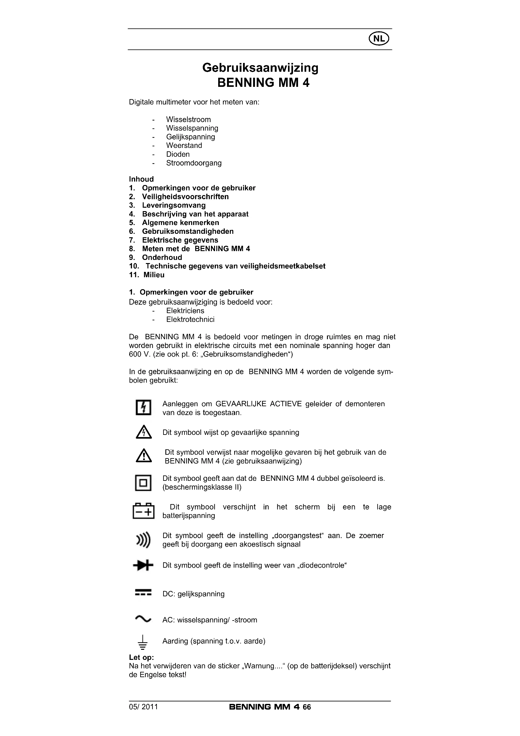 Deze gebruiksaanwijziging is bedoeld voor: - Elektriciens - Elektrotechnici De BENNING MM 4 is bedoeld voor metingen in droge ruimtes en mag niet worden gebruikt in elektrische circuits met een nominale spanning hoger dan 600 V. (zie ook pt. 6: „Gebruiksomstandigheden“) In de gebruiksaanwijzing en op de BENNING MM 4 worden de volgende sym- bolen gebruikt: Aanleggen om GEVAARLIJKE ACTIEVE geleider of demonteren van deze is toegestaan.