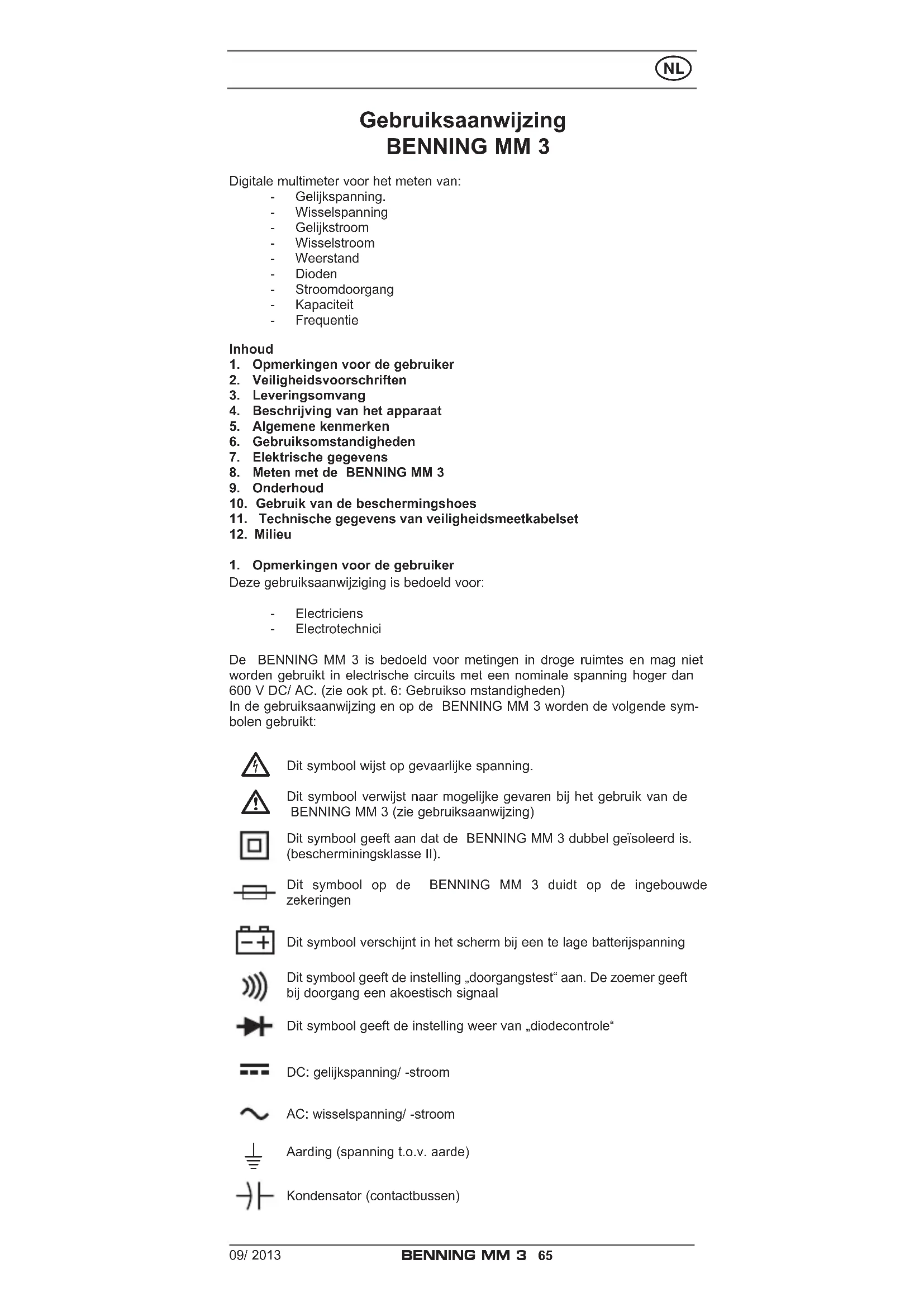 Deze gebruiksaanwijziging is bedoeld voor: - Electriciens - Electrotechnici De BENNING MM 3 is bedoeld voor metingen in droge ruimtes en mag niet worden gebruikt in electrische circuits met een nominale spanning hoger dan 600 V DC/ AC. (zie ook pt. 6: Gebruikso mstandigheden) In de gebruiksaanwijzing en op de BENNING MM 3 worden de volgende sym- bolen gebruikt: