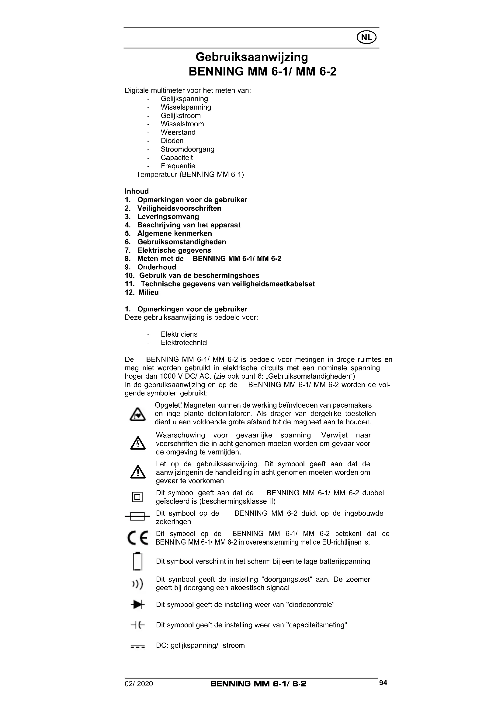 Dit symbool geeft aan dat de BENNING MM 6-1/ MM 6-2 dubbel geïsoleerd is (beschermingsklasse II) Dit symbool op de BENNING MM 6-2 duidt op de ingebouwde zekeringen Dit symbool op de BENNING MM 6-1/ MM 6-2 betekent dat de BENNING MM 6-1/ MM 6-2 in overeenstemming met de EU-richtlijnen is. Dit symbool verschijnt in het scherm bij een te lage batterijspanning Dit symbool geeft de instelling "doorgangstest" aan. De zoemer geeft bij doorgang een akoestisch signaal Dit symbool geeft de instelling weer van "diodecontrole" Dit symbool geeft de instelling weer van "capaciteitsmeting" DC: gelijkspanning/ -stroom02/ 2020