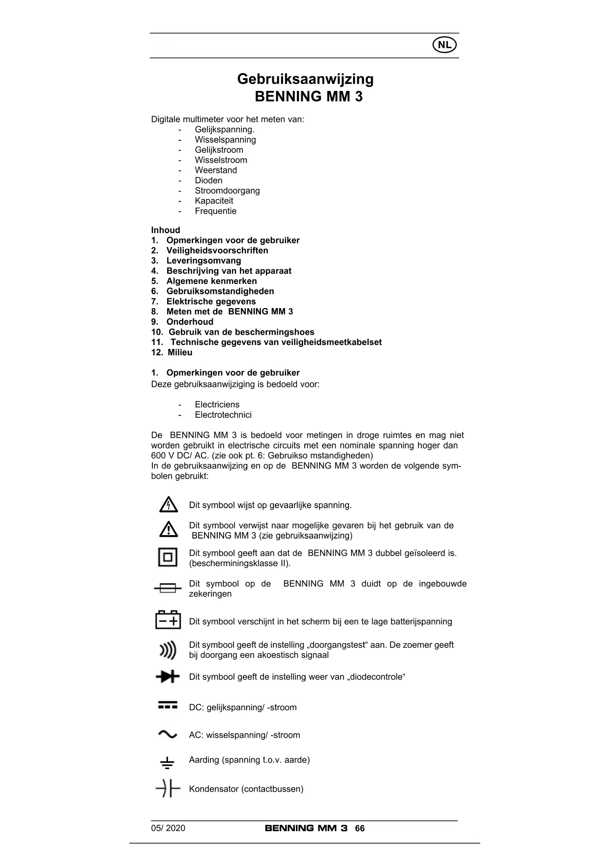 Deze gebruiksaanwijziging is bedoeld voor: - Electriciens - Electrotechnici De BENNING MM 3 is bedoeld voor metingen in droge ruimtes en mag niet worden gebruikt in electrische circuits met een nominale spanning hoger dan 600 V DC/ AC. (zie ook pt. 6: Gebruikso mstandigheden) In de gebruiksaanwijzing en op de BENNING MM 3 worden de volgende sym- bolen gebruikt: