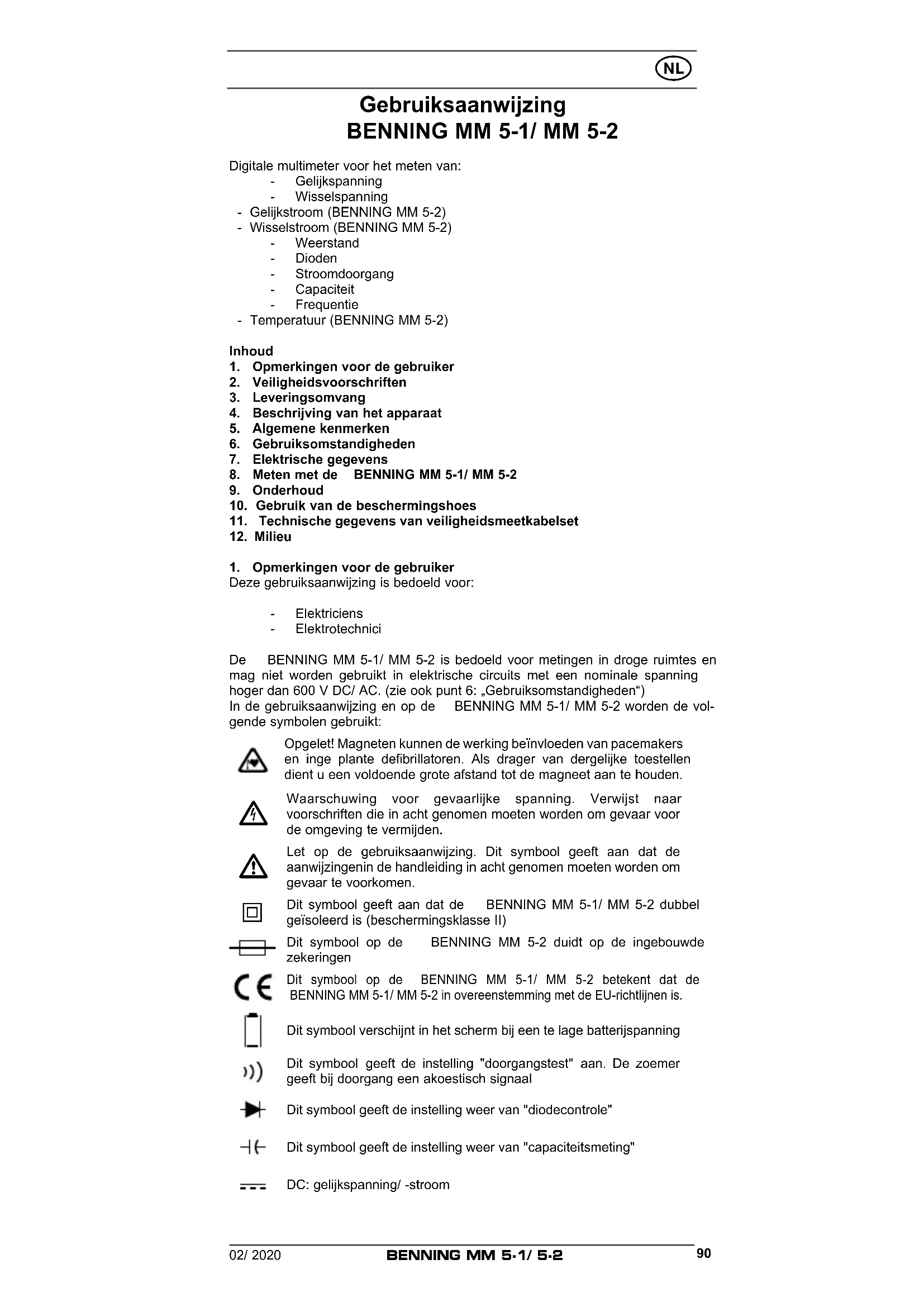 Dit symbool geeft aan dat de BENNING MM 5-1/ MM 5-2 dubbel geïsoleerd is (beschermingsklasse II) Dit symbool op de BENNING MM 5-2 duidt op de ingebouwde zekeringen Dit symbool op de BENNING MM 5-1/ MM 5-2 betekent dat de BENNING MM 5-1/ MM 5-2 in overeenstemming met de EU-richtlijnen is. Dit symbool verschijnt in het scherm bij een te lage batterijspanning Dit symbool geeft de instelling "doorgangstest" aan. De zoemer geeft bij doorgang een akoestisch signaal Dit symbool geeft de instelling weer van "diodecontrole" Dit symbool geeft de instelling weer van "capaciteitsmeting" DC: gelijkspanning/ -stroom02/ 2020