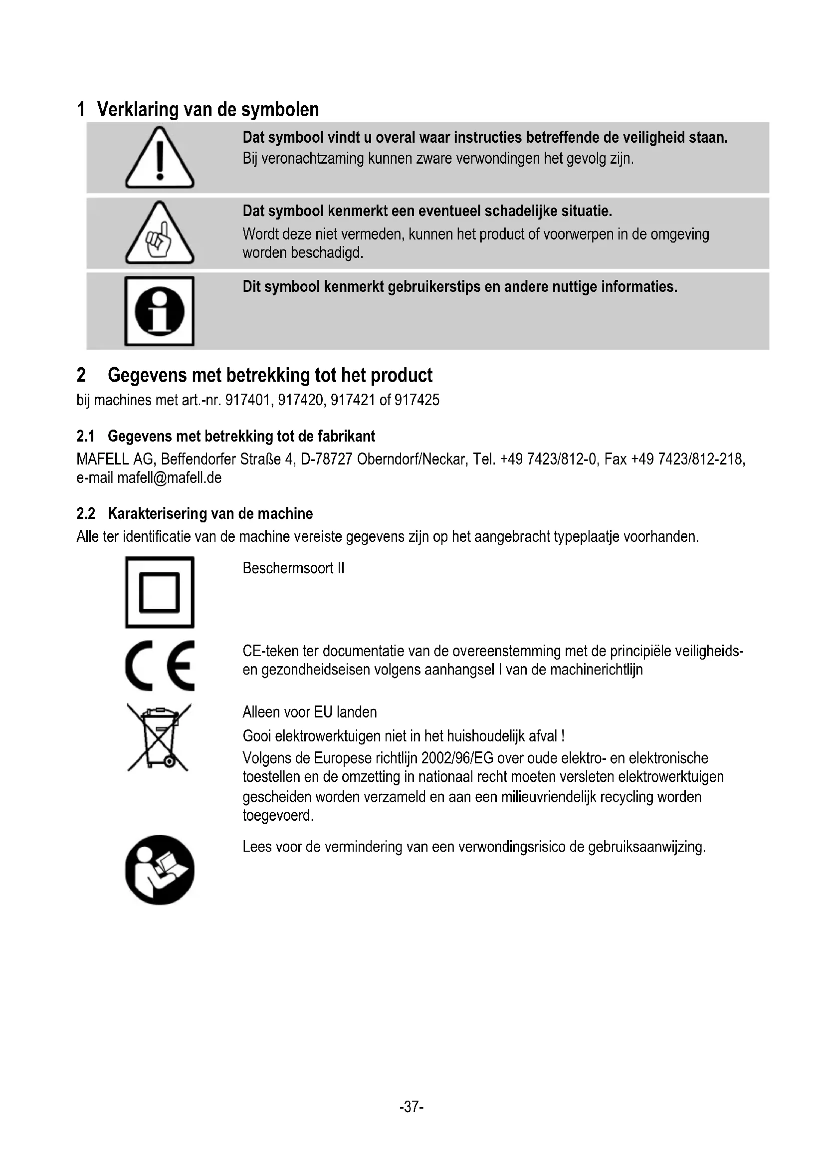 Dit symbool kenmerkt gebruikerstips en andere nuttige informaties. 2 Gegevens met betrekking tot het product bij machines met art.-nr. 917401, 917420, 917421 of 917425