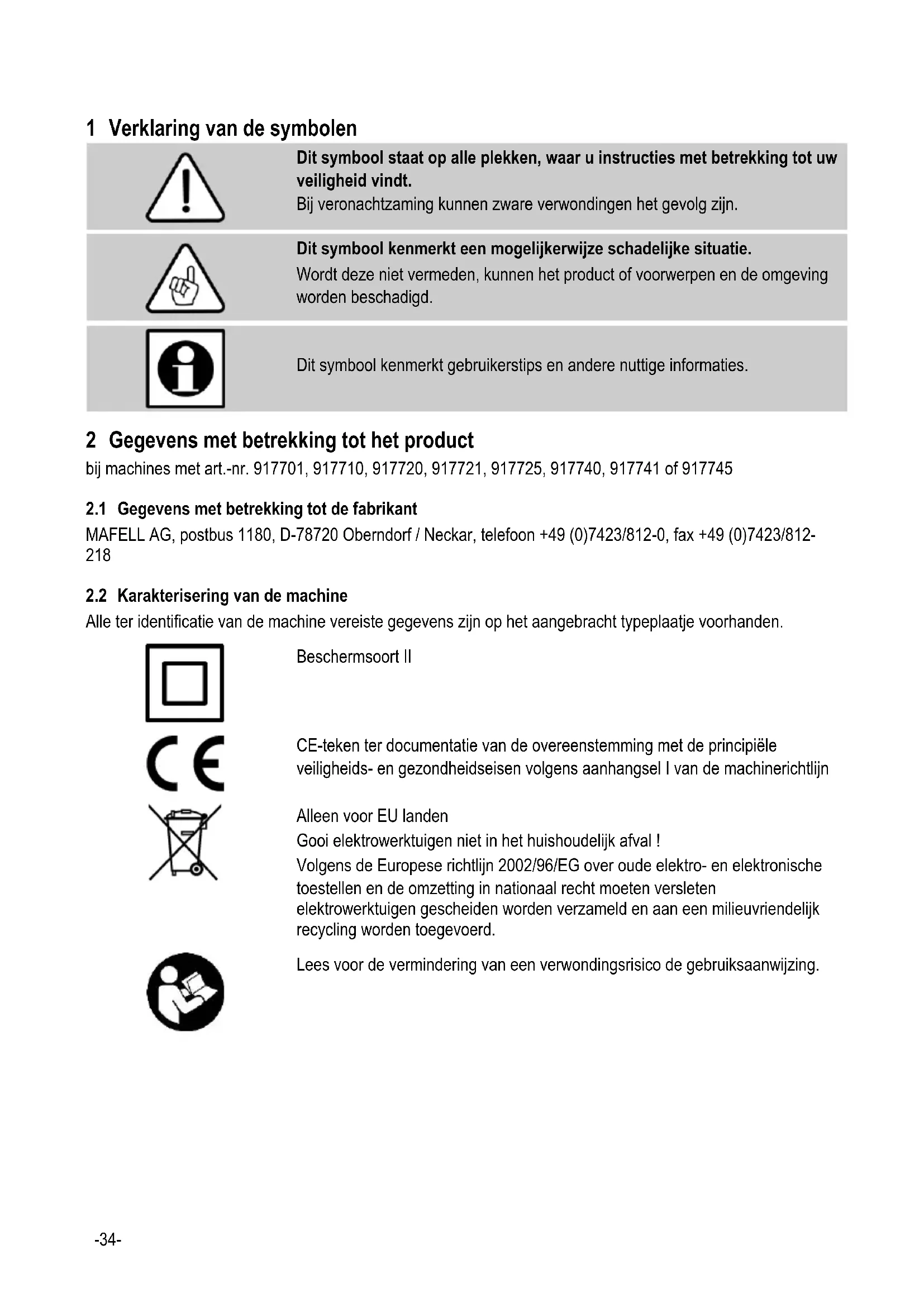 Algemene instructies: - Kinderen en jongeren mogen deze machine niet bedienen. Daarvan uitgesloten zijn jongeren onder toezicht van een deskundige in het kader van hun opleiding. - Werk nooit zonder de voor de desbetreffende handeling voorgeschreven veiligheidsvoorzieningen en verander aan de machine niets dat de veiligheid zou kunnen belemmeren. - Bij het gebruik van de machine buiten wordt de toepassing van een veiligheidsschakelaar geadviseerd. - Beschadigde kabels of stekers moeten onmiddellijk worden vervangen. - Scherpe knikken aan de kabel voorkomen. Vooral bij het transport en het opslaan van de machine de kabel niet om de machine wikkelen. Instructies met betrekking tot het gebruik van persoonlijke veiligheidsuitrustingen: - Draag bij het werk altijd een gehoorbescherming. - Het stof dat tijdens het werk ontstaat, is vaak schadelijk (bv. bij de behandeling van eiken- en beukenhout, minerale materialen, metaal of verflagen die lood of andere schadelijke stoffen bevatten); dat stof mag niet in het lichaam terechtkomen. Raak het stof niet aan en adem het niet in. Gebruik de stofafzuiging en draag bovendien een geschikt stofmasker. Verwijder afgezet stof grondig bijv. door afzuigen met een hiervoor geschikte speciale zuigmachine. Neem dat ook in acht bij de vervanging van de filterzak. Aanwijzingen met betrekking tot het bedrijf: - Kom met uw handen niet in het zwenkbereik van het slijprooster of de opname ervan. Houd met uw tweede hand de extra greep of de motorbehuizing vast. - Houd het werkstuk nooit in de hand of boven het been vast. Zeker het werkstuk aan een stabiele steun. - Zeker, indien mogelijk, het werkstuk tegen een verschuiven, bijv. met lijmklemmen. - Zorgt u voor een vrije en antislip-zekere standplaats met voldoende verlichting. - Gebruik enkel slijproosters met de afmetingen die in deze gebruiksaanwijzing zijn vermeld. Opmerkingen met betrekking tot onderhoud en reparatie: - De regelmatige reiniging van de machine, vooral van de verstelvoorzieningen en de geleidingen, vormt een belangrijke veiligheidsfactor. - Er mogen enkel originele MAFELL-reseverdelen en toebehoren worden toegepast. Anders bestaat er geen garantieclaim en geen aansprakelijkheid door de fabrikant.-37-