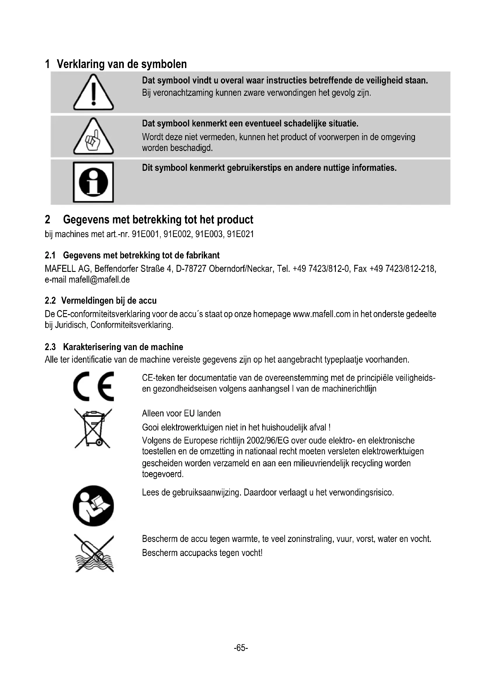 De CE-conformiteitsverklaring voor de accu´s staat op onze homepage www.mafell.com in het onderste gedeelte bij Juridisch, Conformiteitsverklaring.