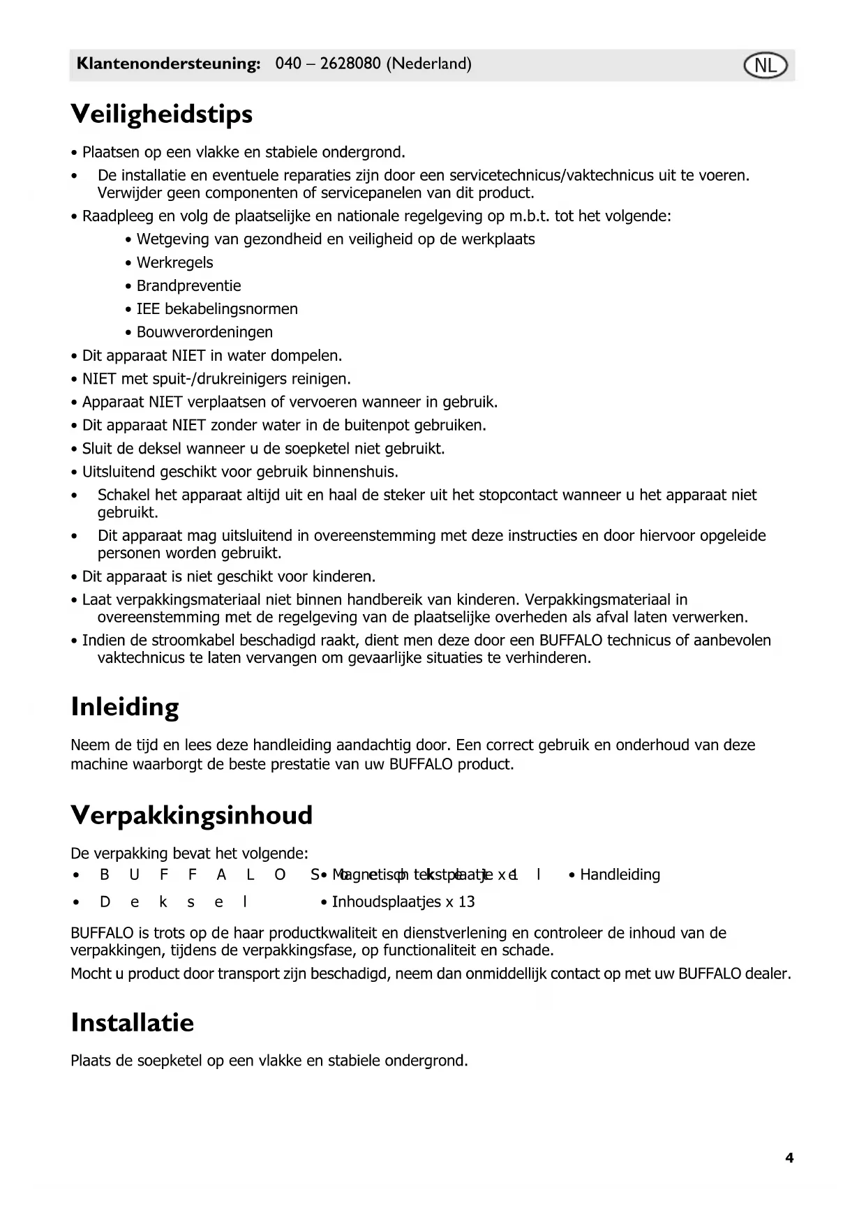 - Indien de stroomkabel beschadigd raakt, dient men deze door een BUFFALO technicus of aanbevolen vaktechnicus te laten vervangen om gevaarlijke situaties te verhinderen. Inleiding Neem de tijd en lees deze handleiding aandachtig door. Een correct gebruik en onderhoud van deze machine waarborgt de beste prestatie van uw BUFFALO product. Verpakkingsinhoud De verpakking bevat het volgende: BUFFALO is trots op de haar productkwaliteit en dienstverlening en controleer de inhoud van de verpakkingen, tijdens de verpakkingsfase, op functionaliteit en schade. Mocht u product door transport zijn beschadigd, neem dan onmiddellijk contact op met uw BUFFALO dealer. Installatie Plaats de soepketel op een vlakke en stabiele ondergrond.