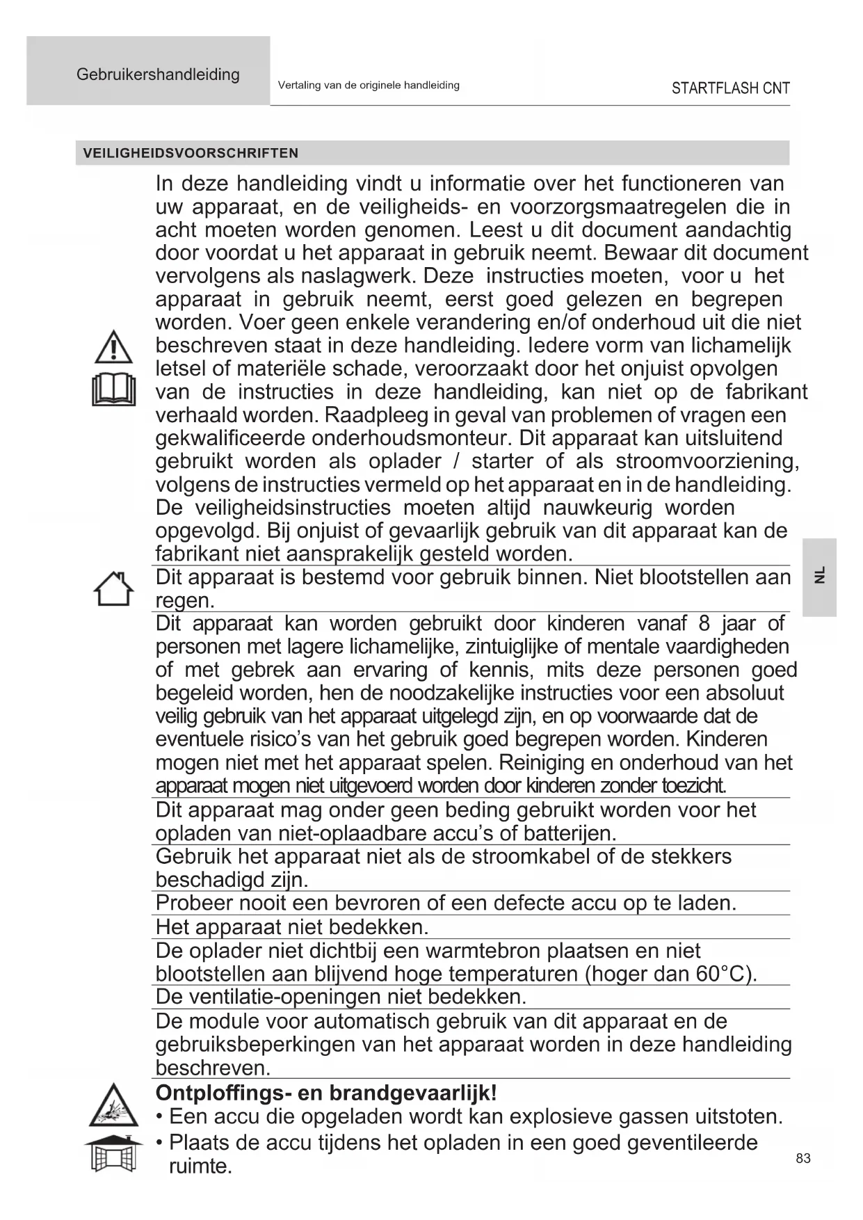 - Plaats de accu tijdens het opladen in een goed geventileerde ruimte.84 Gebruikershandleiding STARTFLASH CNT Vertaling van de originele handleiding