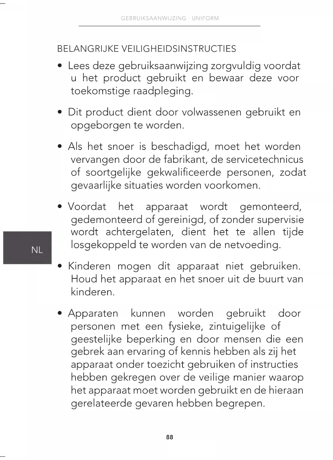 GEBRUIKSAANWIJZING · UNIFORM BELANGRIJKE VEILIGHEIDSINSTRUCTIES