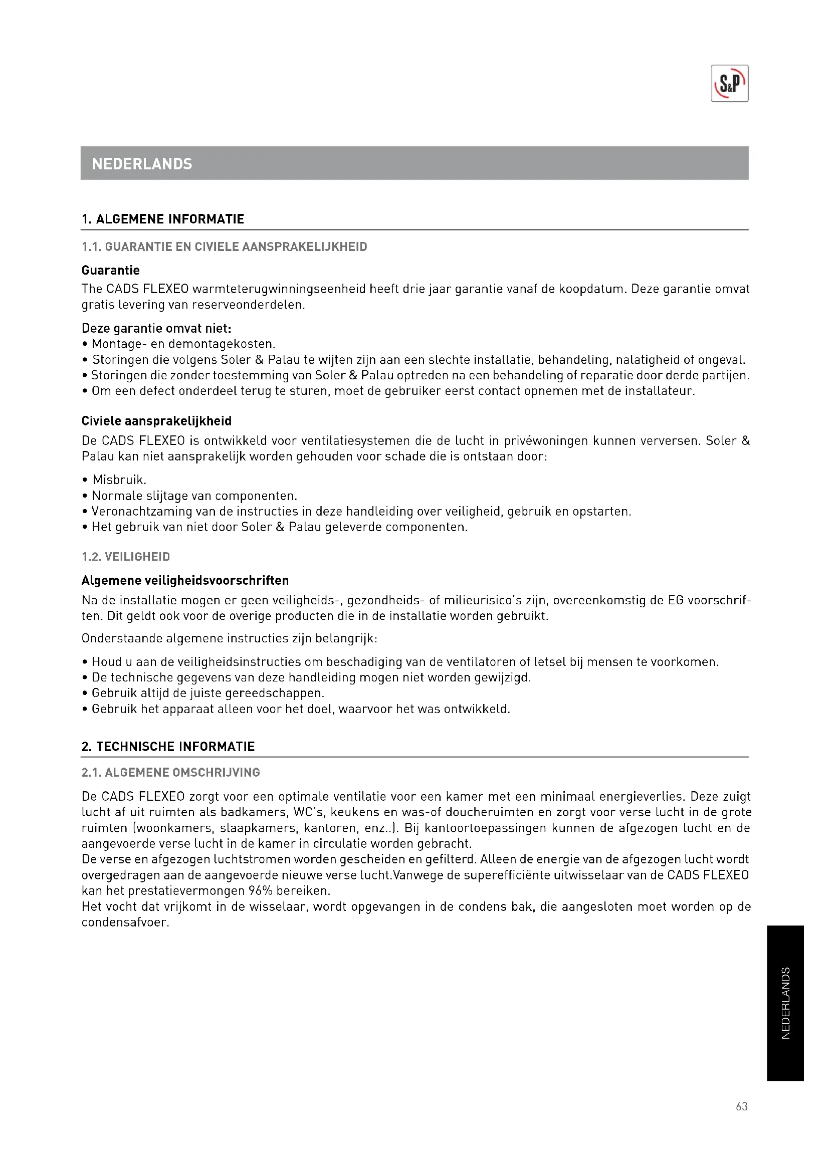 - Om een defect onderdeel terug te sturen, moet de gebruiker eerst contact opnemen met de installateur. Civiele aansprakelijkheid De CADS FLEXEO is ontwikkeld voor ventilatiesystemen die de lucht in privéwoningen kunnen verversen. Soler & Palau kan niet aansprakelijk worden gehouden voor schade die is ontstaan door: