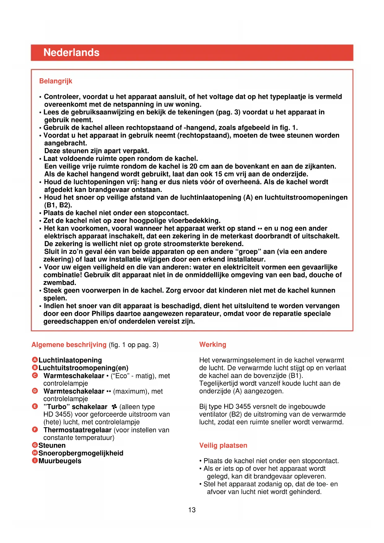 Algemene beschrijving (fig. 1 op pag. 3) A Luchtinlaatopening B Luchtuitstroomopening(en) C Warmteschakelaar • (“Eco” - matig), met controlelampje D Warmteschakelaar •• (maximum), met controlelampje E ”Turbo” schakelaar > (alleen type HD 3455) voor geforceerde uitstroom van (hete) lucht, met controlelampje F Thermostaatregelaar (voor instellen van constante temperatuur) G Steunen H Snoeropbergmogelijkheid I Muurbeugels Werking Het verwarmingselement in de kachel verwarmt de lucht. De verwarmde lucht stijgt op en verlaat de kachel aan de bovenzijde (B1). Tegelijkertijd wordt vanzelf koude lucht aan de onderzijde (A) aangezogen. Bij type HD 3455 versnelt de ingebouwde ventilator (B2) de uitstroming van de verwarmde lucht, zodat een ruimte sneller wordt verwarmd. Veilig plaatsen