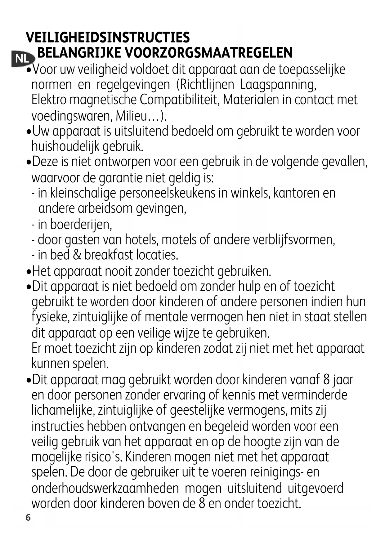- Dit apparaat mag gebruikt worden door kinderen vanaf 8 jaar en door personen zonder ervaring of kennis met verminderde lichamelijke, zintuiglijke of geestelijke vermogens, mits zij instructies hebben ontvangen en begeleid worden voor een veilig gebruik van het apparaat en op de hoogte zijn van de mogelijke risico's. Kinderen mogen niet met het apparaat spelen. De door de gebruiker uit te voeren reinigings- en onderhoudswerkzaamheden mogen uitsluitend uitgevoerd worden door kinderen boven de 8 en onder toezicht.