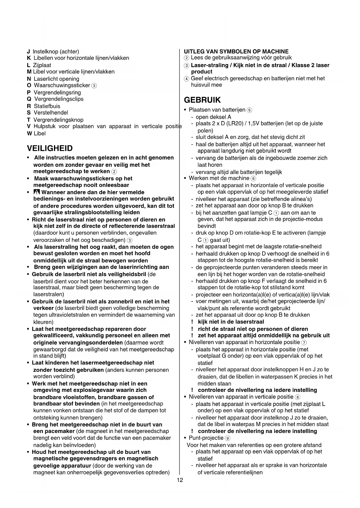 - Bewaardezeinstructieszorgvuldigengeefzebij hetdoorgevenvanhetmeetgereedschapmee TECHNISCHE GEGEVENS Lasertype 635 nm, <2,2 mW Laserklasse 2 Energievoorziening 2 x D (LR20) / 1,5V batterij Gebruikstemperatuur -10°C tot 40°C Bewaartemperatuur -10°C tot +40°C Gewicht 1,3 kg Nauwkeurigheid ± 0,7 mm/m MACHINE-ELEMENTEN1 A Deksel van batterijvak B Aan/uit schakelaar C LED-lampje D Knop voor verhogen rotatie-snelheid E Rotatie-kop F Knop voor verlagen rotatie-snelheid G Voetplaat H Instelknop (voor) 11J Instelknop (achter) k Libellen voor horizontale lijnen/vlakken L Zijplaat m Libel voor verticale lijnen/vlakken N Laserlicht opening O Waarschuwingssticker 3 P Vergrendelingsring Q Vergrendelingsclips R Statiefbuis S Verstelhendel T Vergrendelingsknop V Hulpstuk voor plaatsen van apparaat in verticale positie w Libel VEILIGHEID