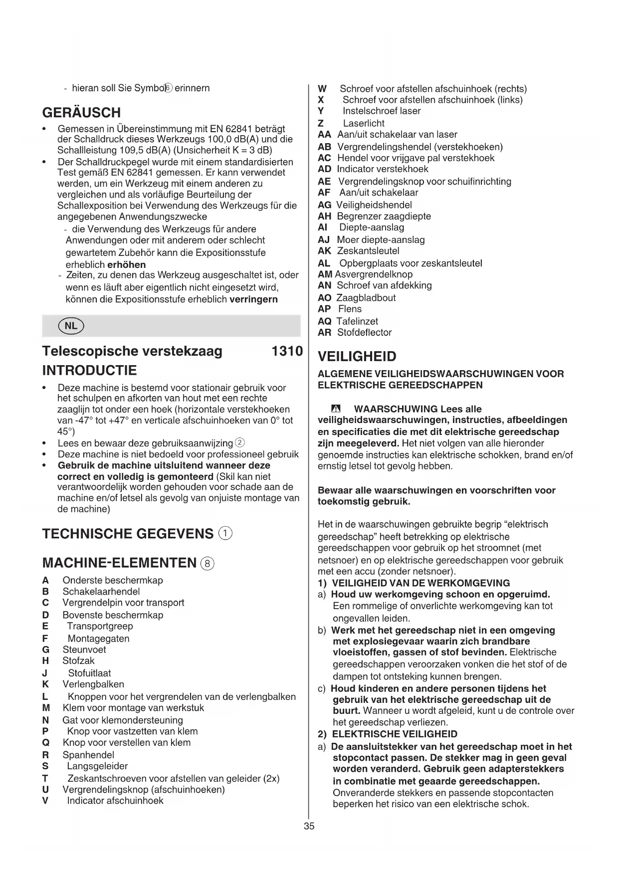 - gebogenes oder rundes Sägegut muss besonders gegen Wegrutschen gesichert werden c35 W Schroef voor afstellen afschuinhoek (rechts) X Schroef voor afstellen afschuinhoek (links) Y Instelschroef laser Z Laserlicht AA Aan/uit schakelaar van laser AB Vergrendelingshendel (verstekhoeken) AC Hendel voor vrijgave pal verstekhoek AD Indicator verstekhoek AE Vergrendelingsknop voor schuinrichting AF Aan/uit schakelaar AG Veiligheidshendel AH Begrenzer zaagdiepte AI Diepte-aanslag AJ Moer diepte-aanslag AK Zeskantsleutel AL Opbergplaats voor zeskantsleutel AM Asvergrendelknop AN Schroef van afdekking AO Zaagbladbout AP Flens AQ Tafelinzet AR Stofdeector VEILIGHEID