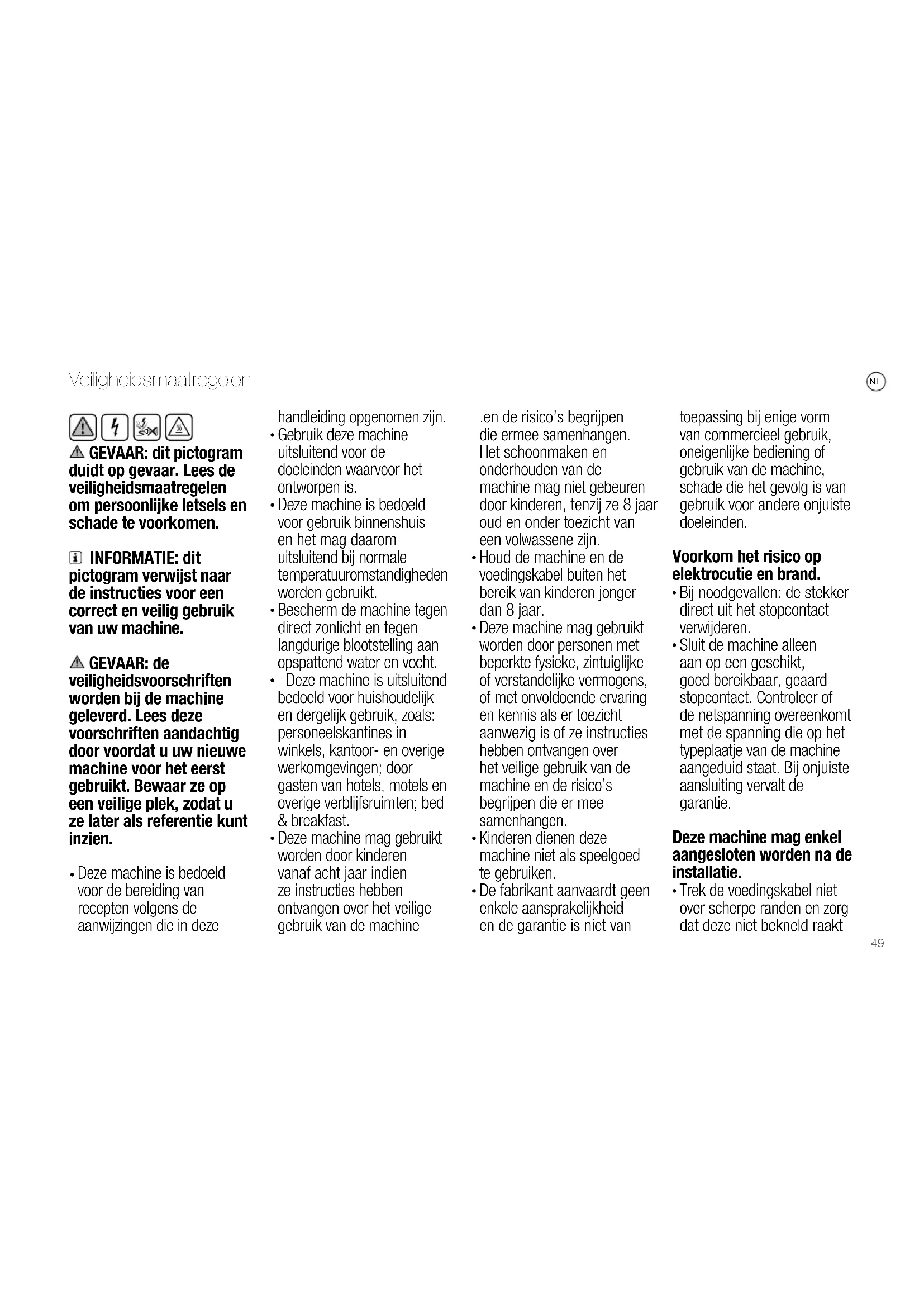 Veiligheidsmaatregelen GEVAAR: dit pictogram duidt op gevaar. Lees de veiligheidsmaatregelen om persoonlijke letsels en schade te voorkomen. INFORMATIE: dit pictogram verwijst naar de instructies voor een correct en veilig gebruik van uw machine. GEVAAR: de veiligheidsvoorschriften worden bij de machine geleverd. Lees deze voorschriften aandachtig door voordat u uw nieuwe machine voor het eerst gebruikt. Bewaar ze op een veilige plek, zodat u ze later als referentie kunt inzien.