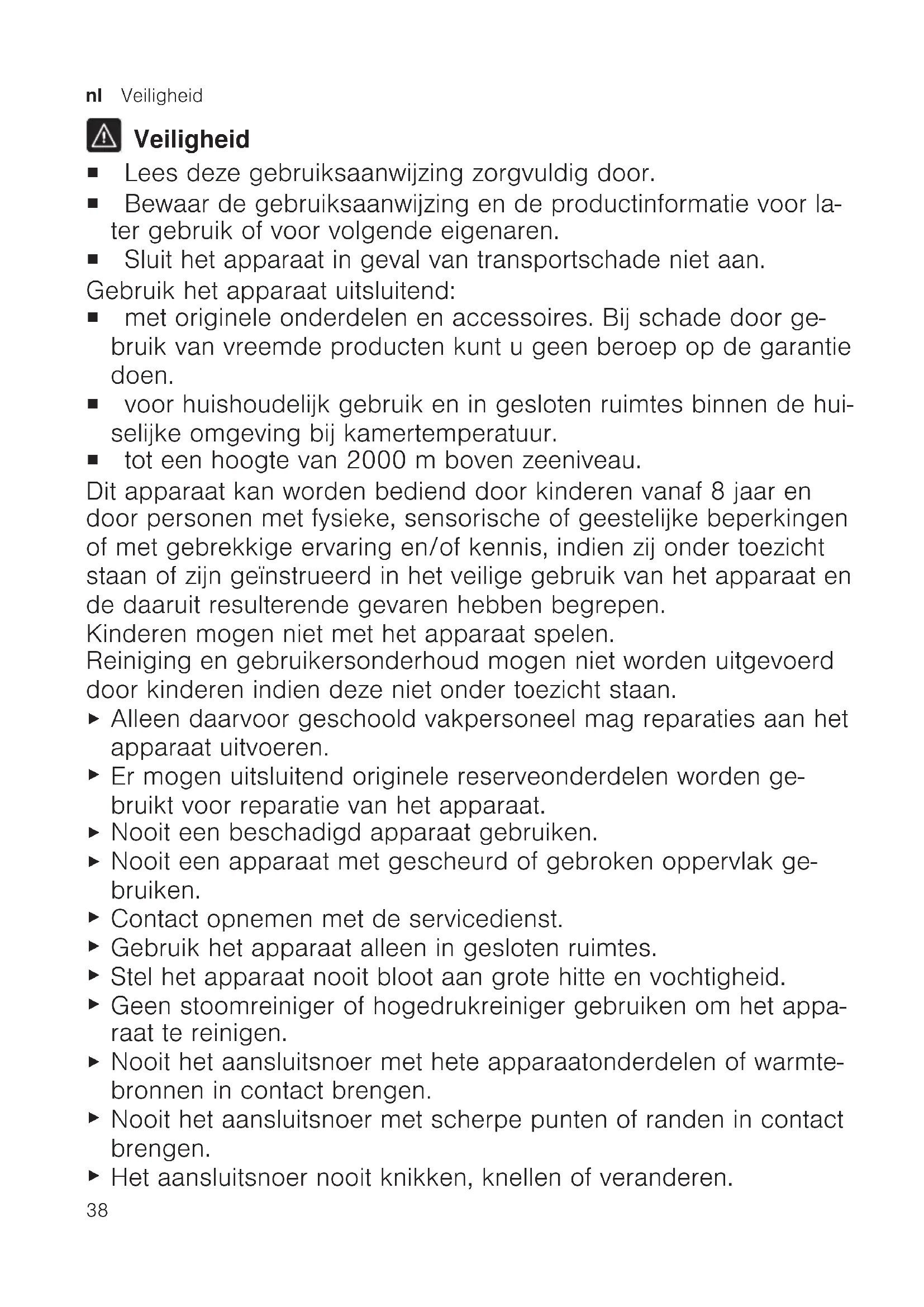 Veiligheid ¡ Lees deze gebruiksaanwijzing zorgvuldig door. ¡ Bewaar de gebruiksaanwijzing en de productinformatie voor la- ter gebruik of voor volgende eigenaren. ¡ Sluit het apparaat in geval van transportschade niet aan. Gebruik het apparaat uitsluitend: ¡ met originele onderdelen en accessoires. Bij schade door ge- bruik van vreemde producten kunt u geen beroep op de garantie doen. ¡ voor huishoudelijk gebruik en in gesloten ruimtes binnen de hui- selijke omgeving bij kamertemperatuur. ¡ tot een hoogte van 2000m boven zeeniveau. Dit apparaat kan worden bediend door kinderen vanaf 8 jaar en door personen met fysieke, sensorische of geestelijke beperkingen of met gebrekkige ervaring en/of kennis, indien zij onder toezicht staan of zijn geïnstrueerd in het veilige gebruik van het apparaat en de daaruit resulterende gevaren hebben begrepen. Kinderen mogen niet met het apparaat spelen. Reiniging en gebruikersonderhoud mogen niet worden uitgevoerd door kinderen indien deze niet onder toezicht staan.