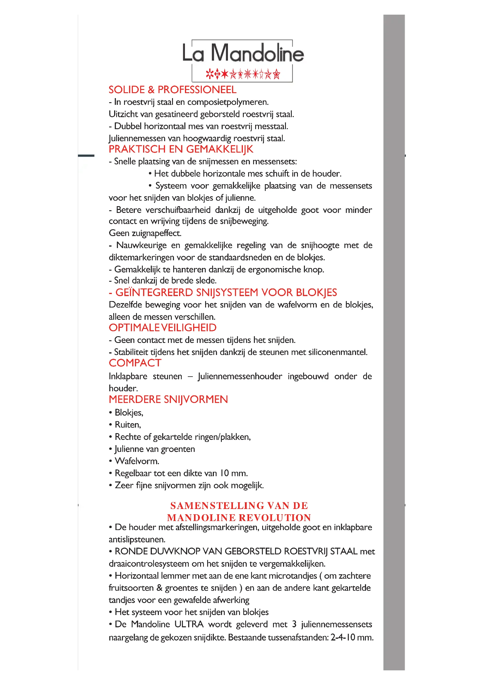 - Außerhalb der Reichweite von Kindern halten. Bestandteile des langen Schiebers: Kunststoffschlitten für die Aufnahme des Schnittguts und Kunststoffschieber mit Edelstahlgriff. Stifte auf der Unterseite des Schiebers halten das Schnittgut fest. Einlegen des Schlittens genauso wie bei Verwendung von rundem Schlitten und Schieber. Schneiden durch hin- und herbewegen. Achtung: mit dem langen Schieber lassen sich keine Waffelschnitte, Wür- felschnitte und Rauten herstellen.SOLIDE & PROFESSIONEEL- In roestvrij staal en composietpolymeren. Uitzicht van gesatineerd geborsteld roestvrij staal. - Dubbel horizontaal mes van roestvrij messtaal.Juliennemessen van hoogwaardig roestvrij staal.PRAKTISCH EN GEMAKKELIJK- Snelle plaatsing van de snijmessen en messensets:• Het dubbele horizontale mes schuift in de houder.• Systeem voor gemakkelijke plaatsing van de messensetsvoor het snijden van blokjes of julienne.- Betere verschuifbaarheid dankzij de uitgeholde goot voor mindercontact en wrijving tijdens de snijbeweging. Geen zuignapeffect.- Nauwkeurige en gemakkelijke regeling van de snijhoogte met dediktemarkeringen voor de standaardsneden en de blokjes.- Gemakkelijk te hanteren dankzij de ergonomische knop.- Snel dankzij de brede slede.- GEÏNTEGREERD SNIJSYSTEEM VOOR BLOKJESDezelfde beweging voor het snijden van de wafelvorm en de blokjes,alleen de messen verschillen.OPTIMALE VEILIGHEID - Geen contact met de messen tijdens het snijden.- Stabiliteit tijdens het snijden dankzij de steunen met siliconenmantel.COMPACTInklapbare steunen – Juliennemessenhouder ingebouwd onder dehouder.MEERDERE SNIJVORMEN• Blokjes, • Ruiten,• Rechte of gekartelde ringen/plakken, • Julienne van groenten • Wafelvorm.• Regelbaar tot een dikte van 10 mm. • Zeer jne snijvormen zijn ook mogelijk. SAMENSTELLING VAN DE MANDOLINE REVOLUTION• De houder met afstellingsmarkeringen, uitgeholde goot en inklapbareantislipsteunen.• RONDE DUWKNOP VAN GEBORSTELD ROESTVRIJ STAAL metdraaicontrolesysteem om het snijden te vergemakkelijken.• Horizontaal lemmer met aan de ene kant microtandjes ( om zachtere fruitsoorten & groentes te snijden ) en aan de andere kant gekarteldetandjes voor een gewafelde afwerking• Het systeem voor het snijden van blokjes• De Mandoline ULTRA wordt geleverd met 3 juliennemessensetsnaargelang de gekozen snijdikte. Bestaande tussenafstanden: 2-4-10 mm.