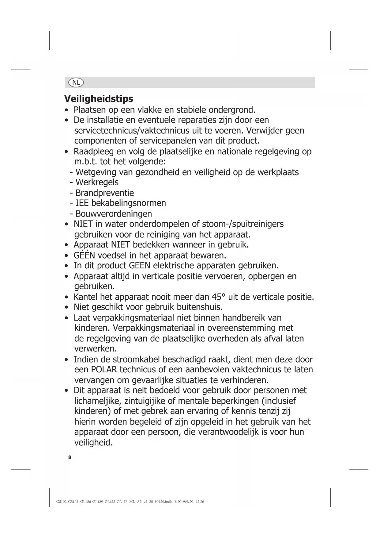- Eventuele reparaties moeten door een POLAR technicus of een vaktechnicus worden uitgevoerd. CS102-CS103_GL186-GL189-GL455-GL457_ML_A5_v5_20190920.indb 10 2019/9/20 15:2611