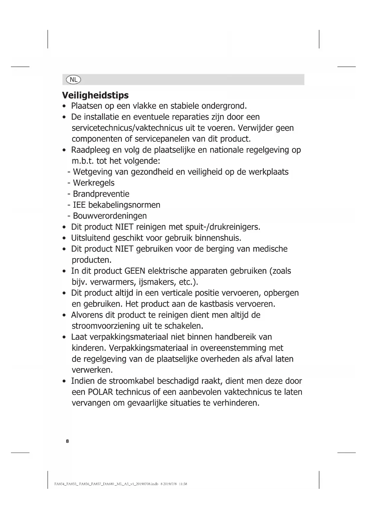 - Indien de stroomkabel beschadigd raakt, dient men deze door een POLAR technicus of een aanbevolen vaktechnicus te laten vervangen om gevaarlijke situaties te verhinderen. FA854_FA855_ FA856_FA857_DA680 _ML_A5_v1_20190708.indb 8 2019/7/8 11:589