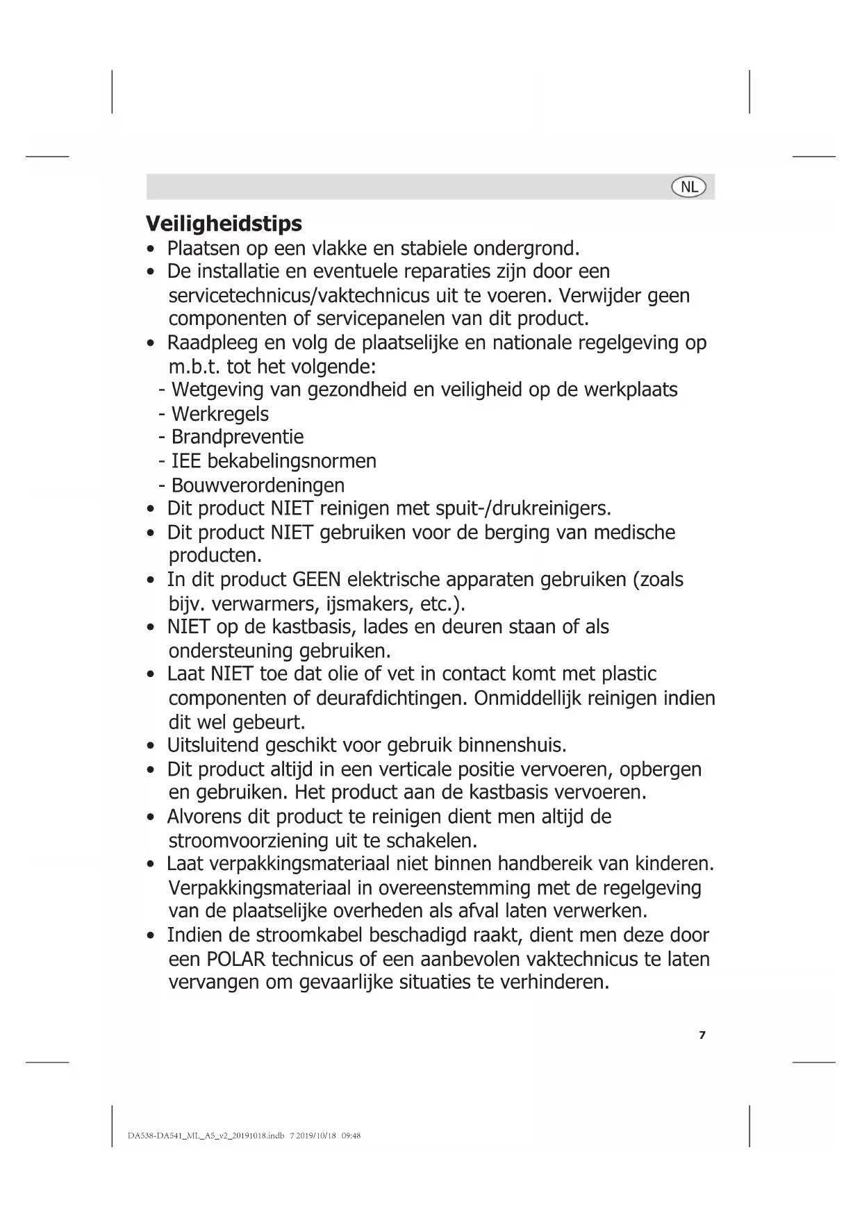 - Indien de stroomkabel beschadigd raakt, dient men deze door een POLAR technicus of een aanbevolen vaktechnicus te laten vervangen om gevaarlijke situaties te verhinderen. DA538-DA541_ML_A5_v2_20191018.indb 7 2019/10/18 09:488