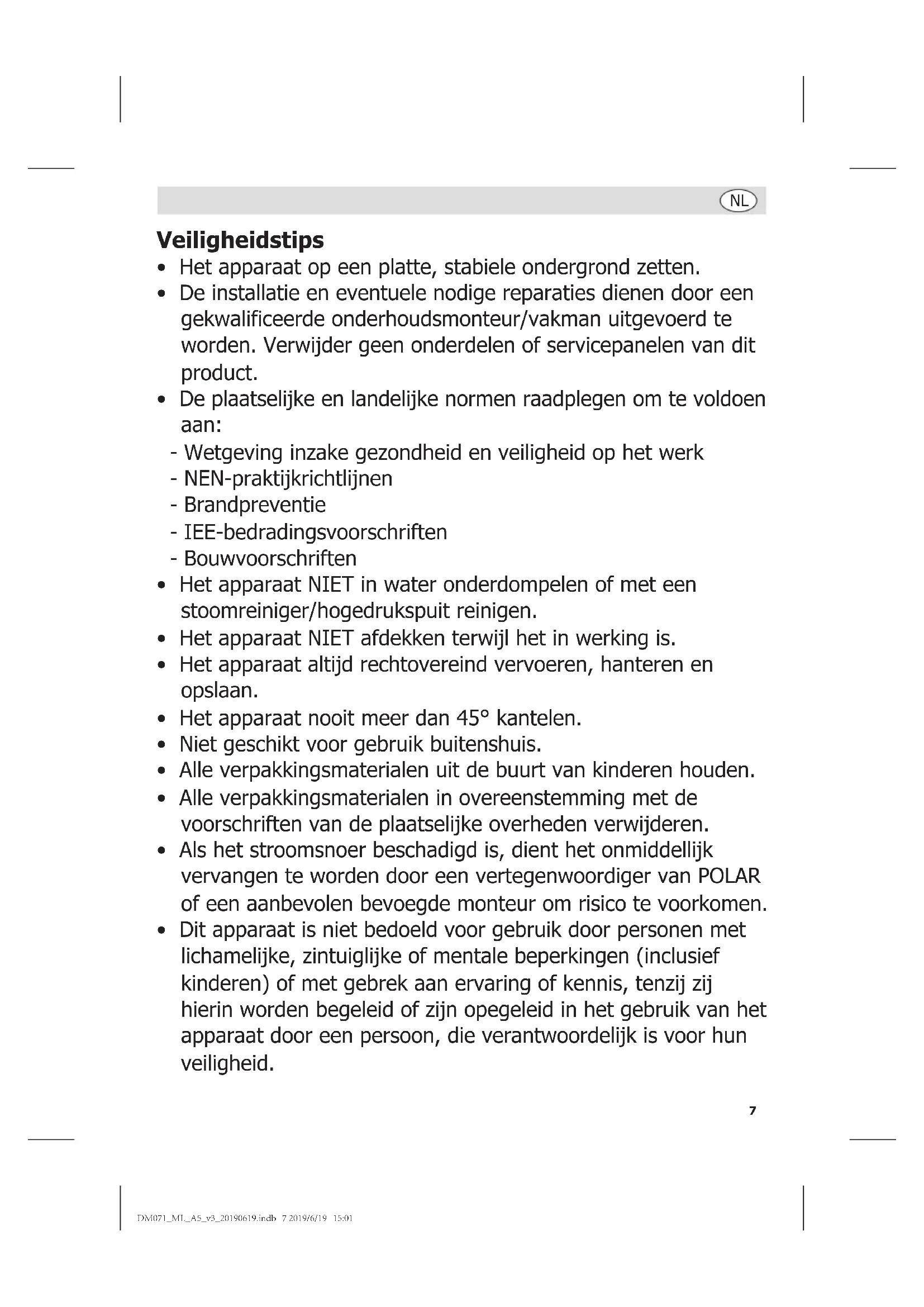 - Handleiding POLAR is trots op zijn kwaliteit en service. Ten tijde van het verpakken was de geleverde apparatuur dan ook volledig functioneel en vrij van schade. Mocht u transportschade constateren, neemt u dan onmiddellijk contact op met uw POLAR-dealer. DM071_ML_A5_v3_20190619.indb 8 2019/6/19 15:019